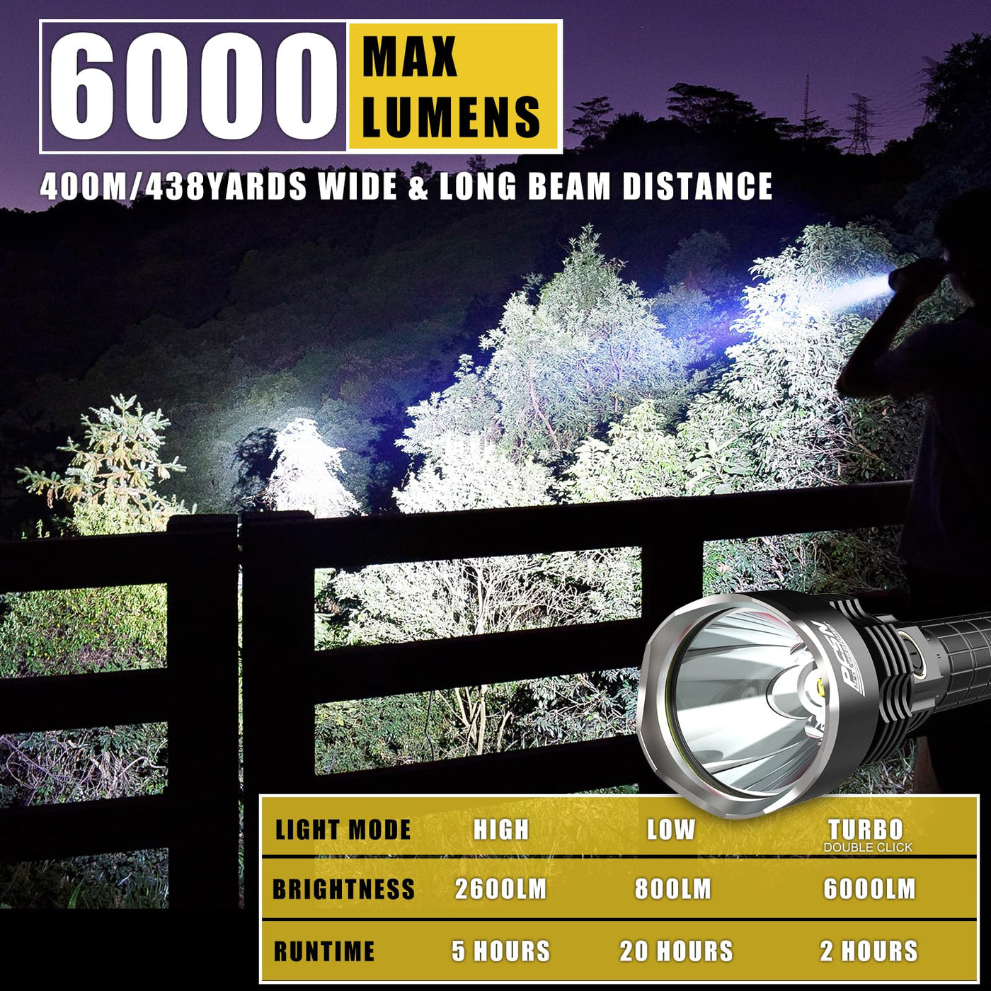 20 Hours Battery Life: Equipped with a 6000mAh battery, this rechargeable flashlight offers up to 20 continuous hours of runtime on the lowest setting, providing reliable light when you need it most.