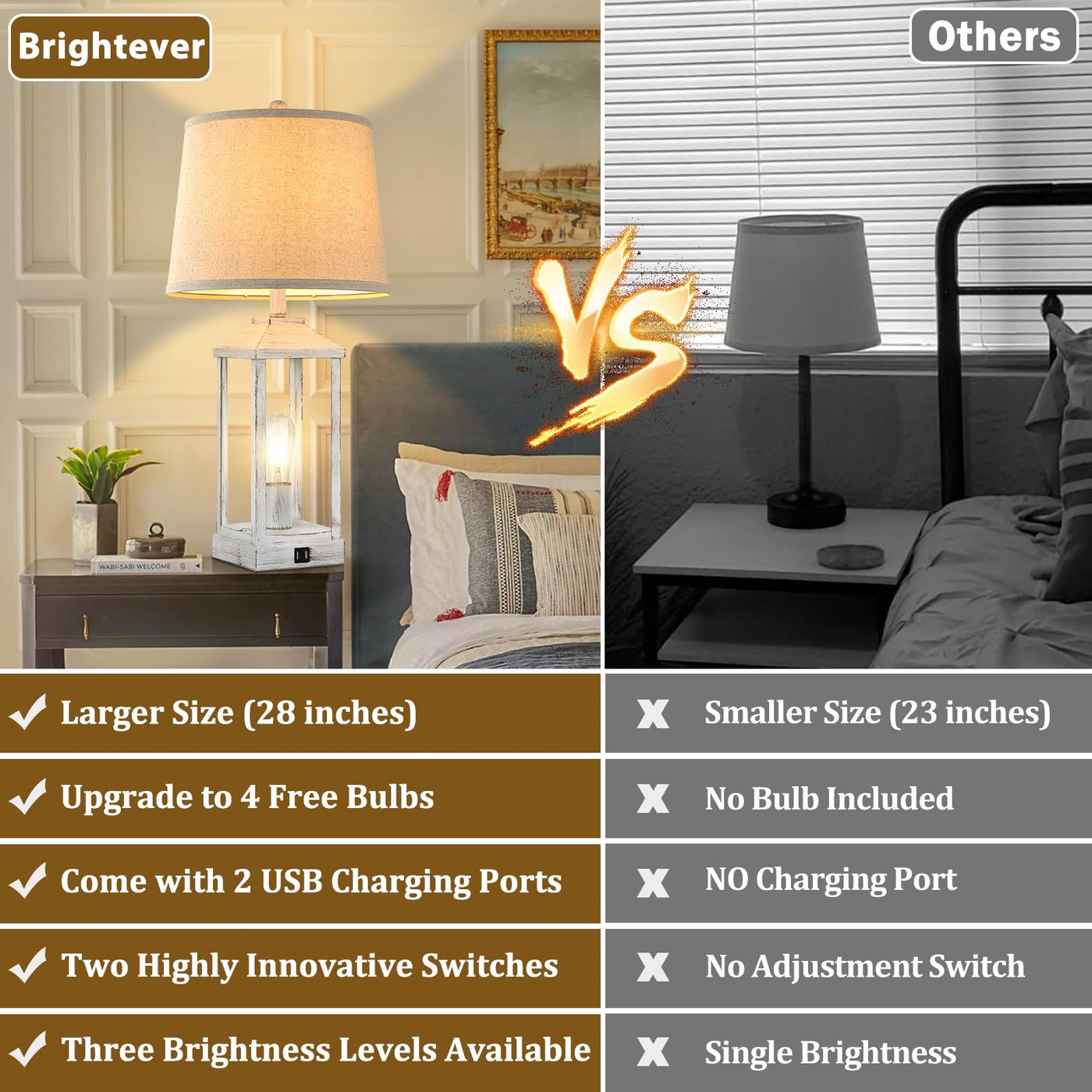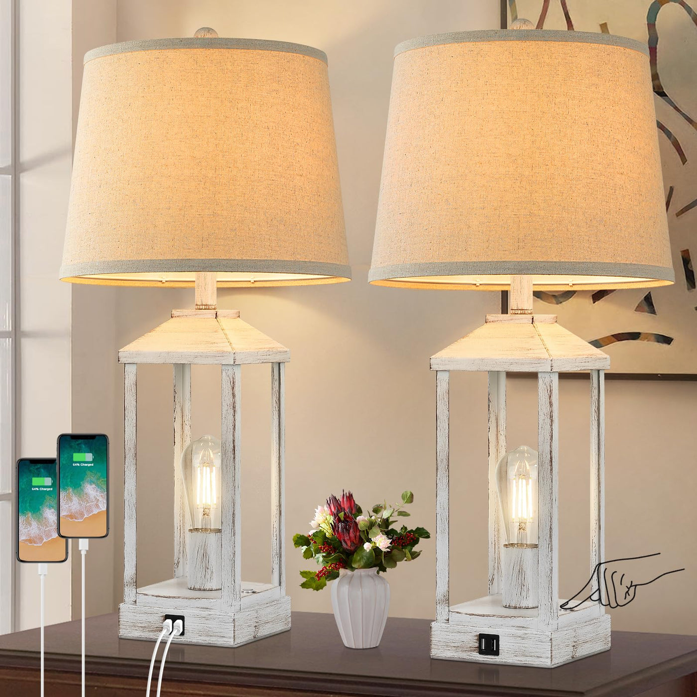 - **Built-In USB Charging Ports**: Stay connected with ease using the convenient dual USB charging ports located on the lamp bases. Charge your smartphones and devices effortlessly, with functionality that remains active whether the lamp is on or off, eliminating the need for extra wall sockets.