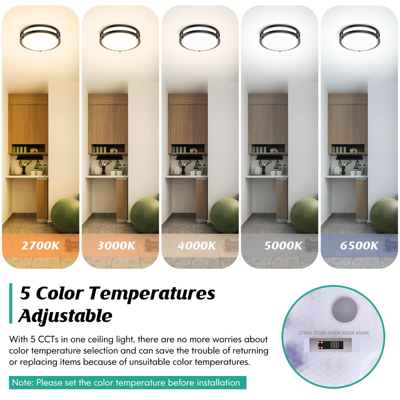 Q: What are the different color temperatures available for this ceiling light?A: This ceiling light offers five adjustable color temperatures: 2700K (Warm White), 3000K (Soft White), 4000K (Neutral White), 5000K (Daylight White), and 6500K (Cool White), allowing you to customize the lighting to suit your mood or setting.