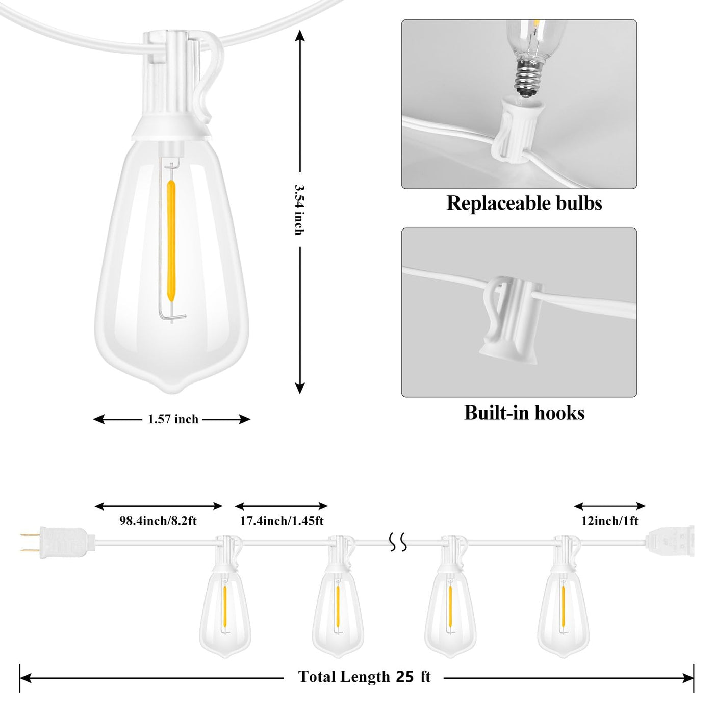 Light Up Your Area With 25Ft Led Shatterproof St38 String Lights -Are You Looking For Energy-Saving Outdoor String Lights To Decorate Your Beautiful Place? -Are You Tired Of Changing The Cheap Quality Patio String Lights That Stop Working Only After A Few Days? -Do You Feel Annoyed When The Bulbs Were Broken And Pieces Fell Out Everywhere? How Frustrating! That? Why We Bring Out These Super Durable Outdoor String Lights For All-Year-Round Use. Awesome Backyard Lightsget Our Bistro Outdoor String Lights In Your Backyard, To Make It Into A Fantastic Vacation Spot. You Could Either Hang Them Zigzag Like The Carnival Market Lights Or Wrap Them On Your Plants Adding A Glamping Atmosphere. What A Wonderful Place To Chill Up With The Lovely People Around You Under These Sparking String Lights. Elegant Romantic Ambience Lighting These Dimmable Cafe String Lights Could Give Off Comfortable And Welcoming Warm Glow. Hanging Them In Your Place, You Can Invite Your Friends To Come For Watching An Outdoor Movie Or Hold A Summer Family Reunion Party. With Our Stunning String Lights, You Could Create Some Unforgettable Memories To Your Life. Perfect Indoor And Outdoor Use String Lights After Numberless Tests, We Produced These Unbreakable String Lights With Great Materials And Technology To Make Sure They Can Work Well With Heavy Rain, Snow, Strong Wind, And Extreme Temperatures. You Could Use Them In Different Regions Of The Country Like Northeast, Southwest, West, Southeast, And Midwest. No Matter Where You Hang Them, They Will Stay Cool And Safe For Your Family To Touch.