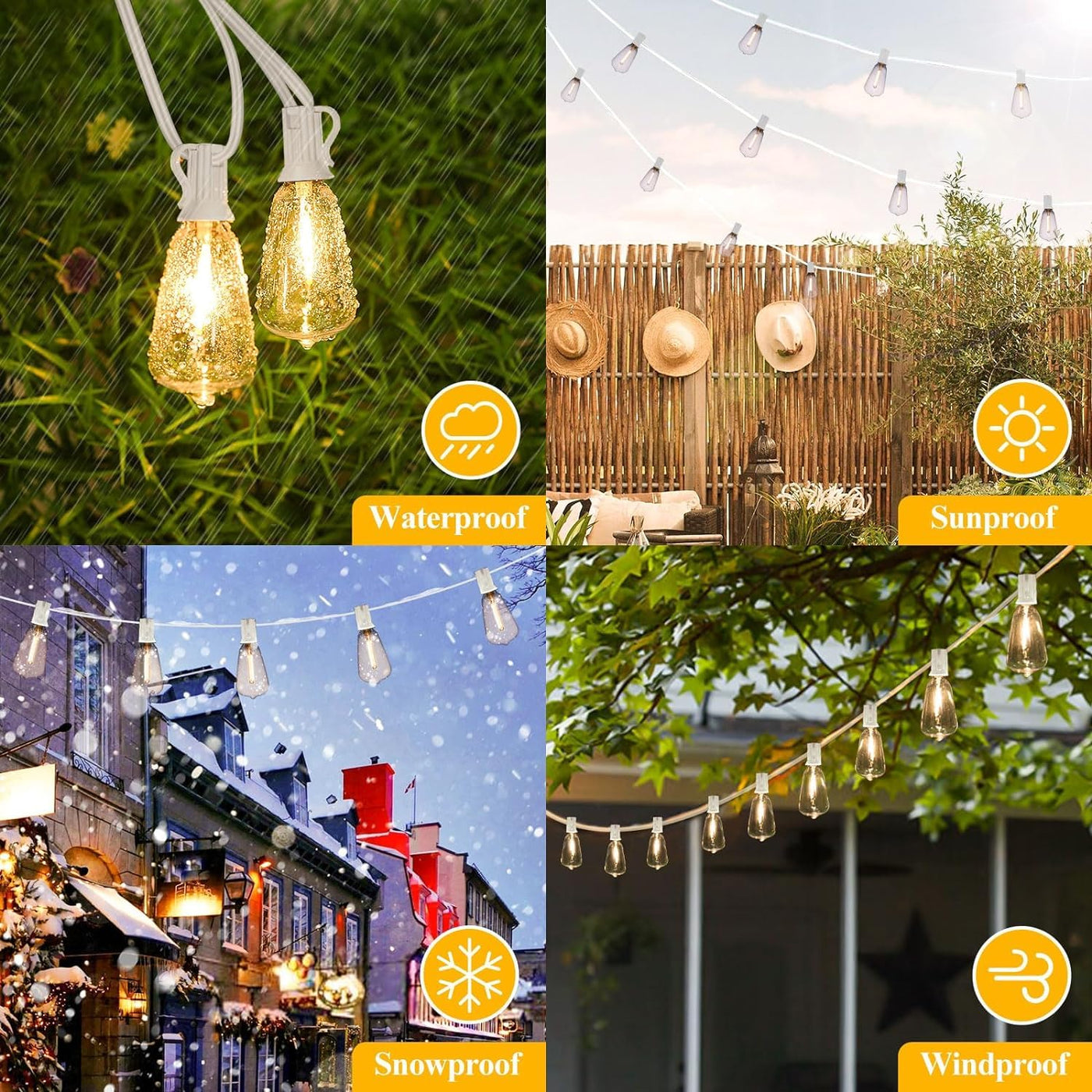 Q: Are these outdoor string lights weatherproof and safe for year-round use?A: Yes, these string lights are designed with weatherproof technology, allowing them to withstand rain, wind, snow, and extreme temperatures up to 158 degrees Fahrenheit, making them safe for year-round outdoor use.