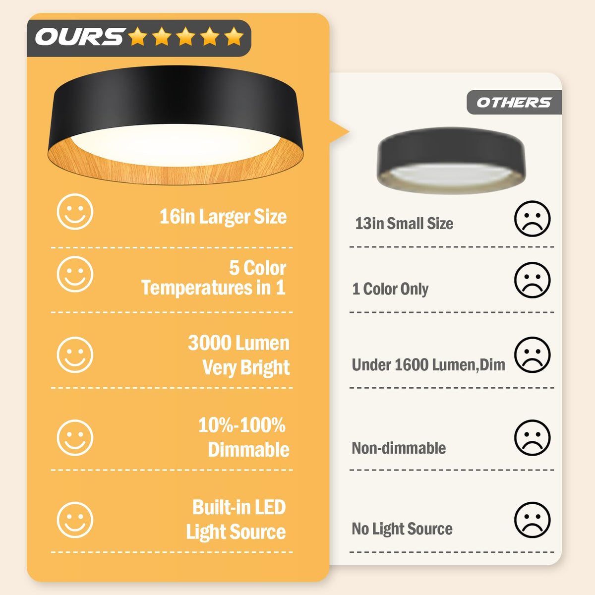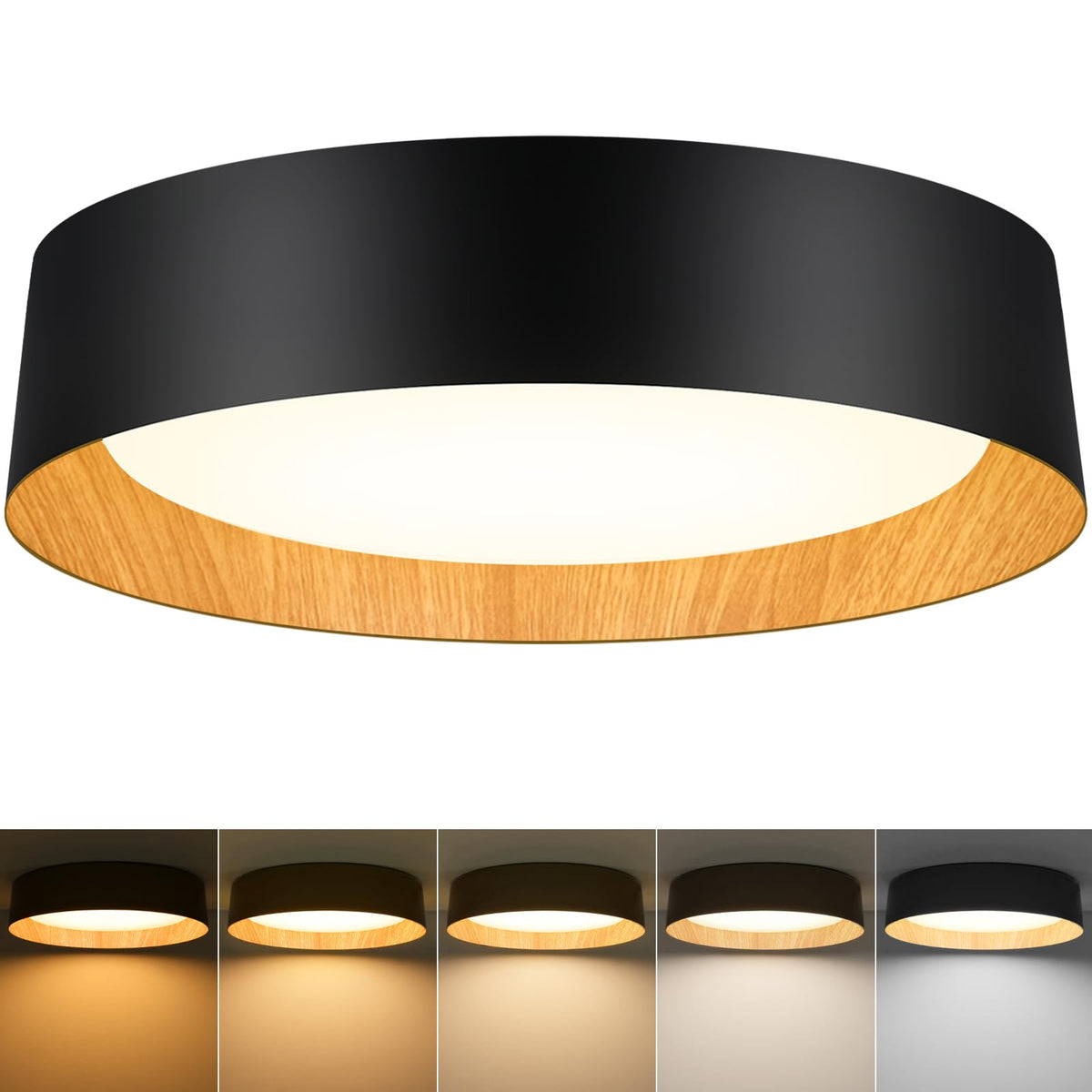 BrightHome LED Ceiling Light Fixture, 16in, Dimmable, 3000LM, 30W, 5CCT (2700K-6000K), Black and Wood,