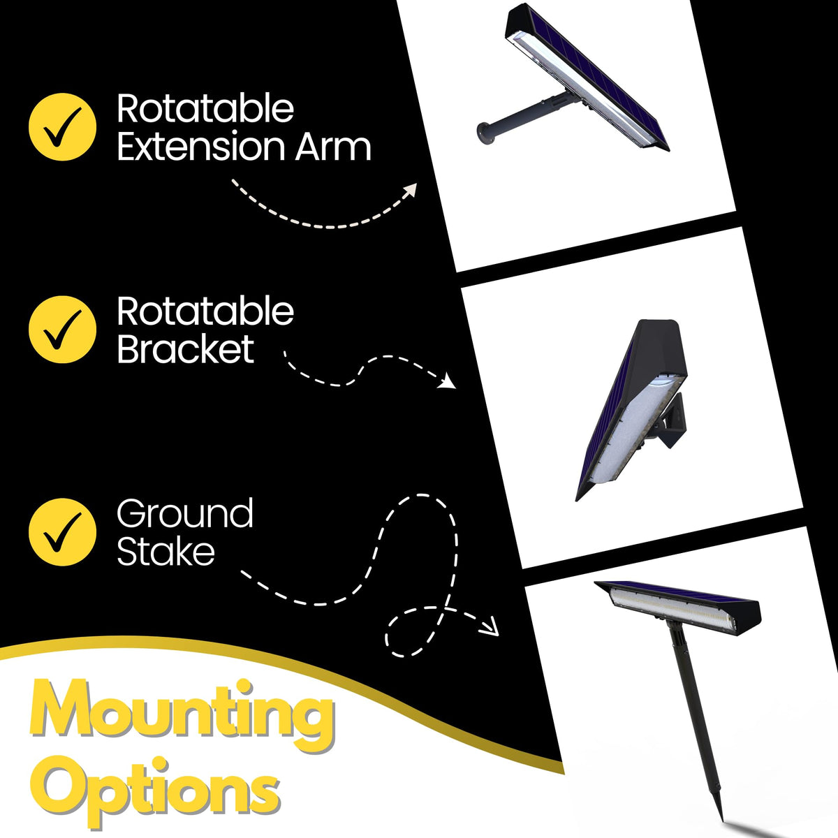 Q: What installation options are available for the BRIGHTICONIC LED light?A: This LED light comes with adjustable mounting brackets, including ground stakes for uplighting, wall brackets, and a pole extender to extend the lighting spread, along with all necessary hardware for easy installation.