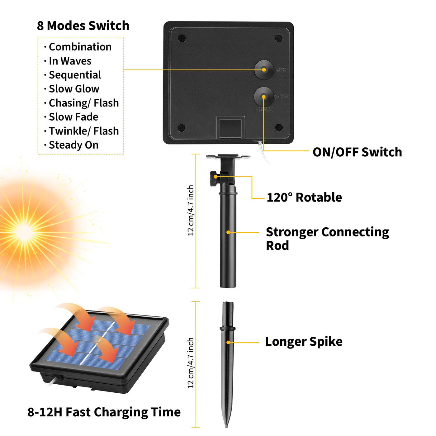 Q: What are the lighting modes available with these solar rope lights?A: The solar rope lights feature 8 lighting modes including fireflies flashing, waves, fading, chasing, flashing, fading slowly, twinkle, and steady-on, allowing you to create the perfect ambiance for any occasion.