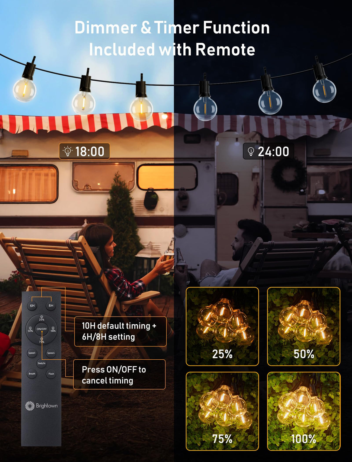 Q: How long do the Brightown solar string lights last on a full charge?A: The Brightown solar string lights can run up to 16 hours on a full charge, making them ideal for all-night outdoor events.