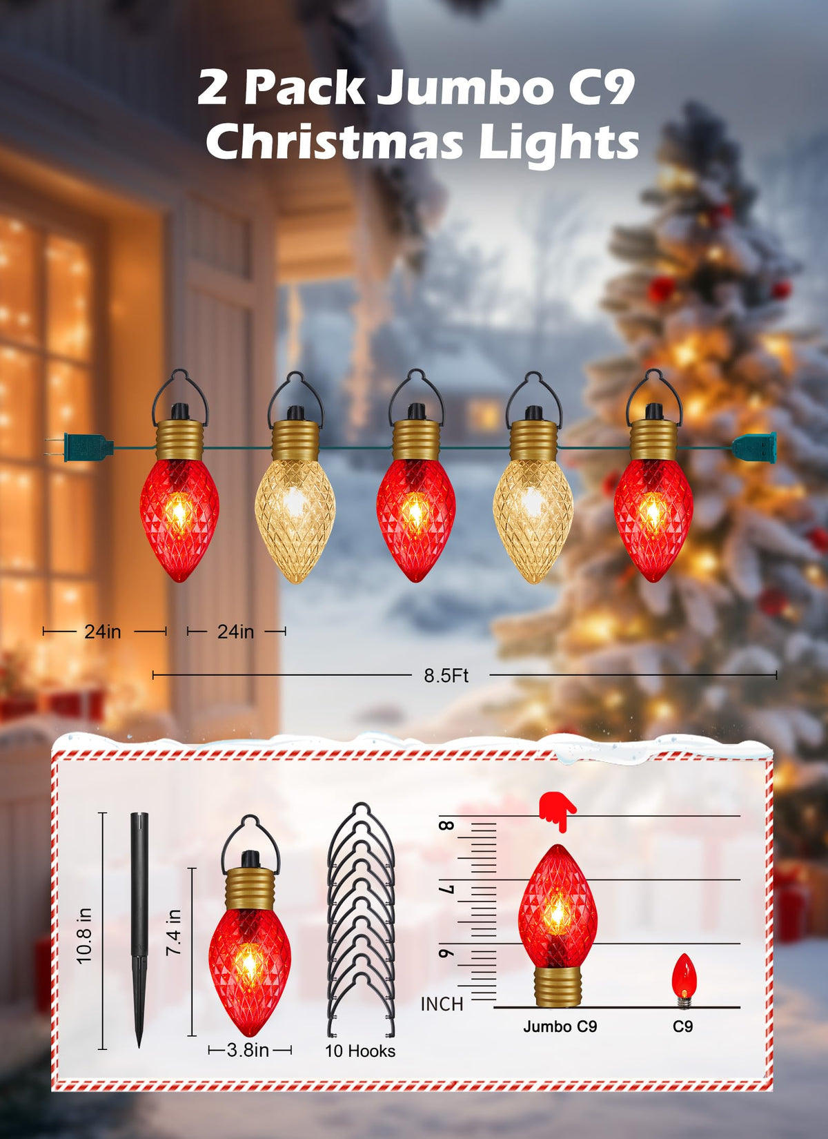 Q: What are the dimensions of the Brightown Jumbo C9 Christmas Pathway Lights?A: The Jumbo C9 bulbs measure 7.4 x 3.8 inches and are spaced 24 inches apart along the string lights.