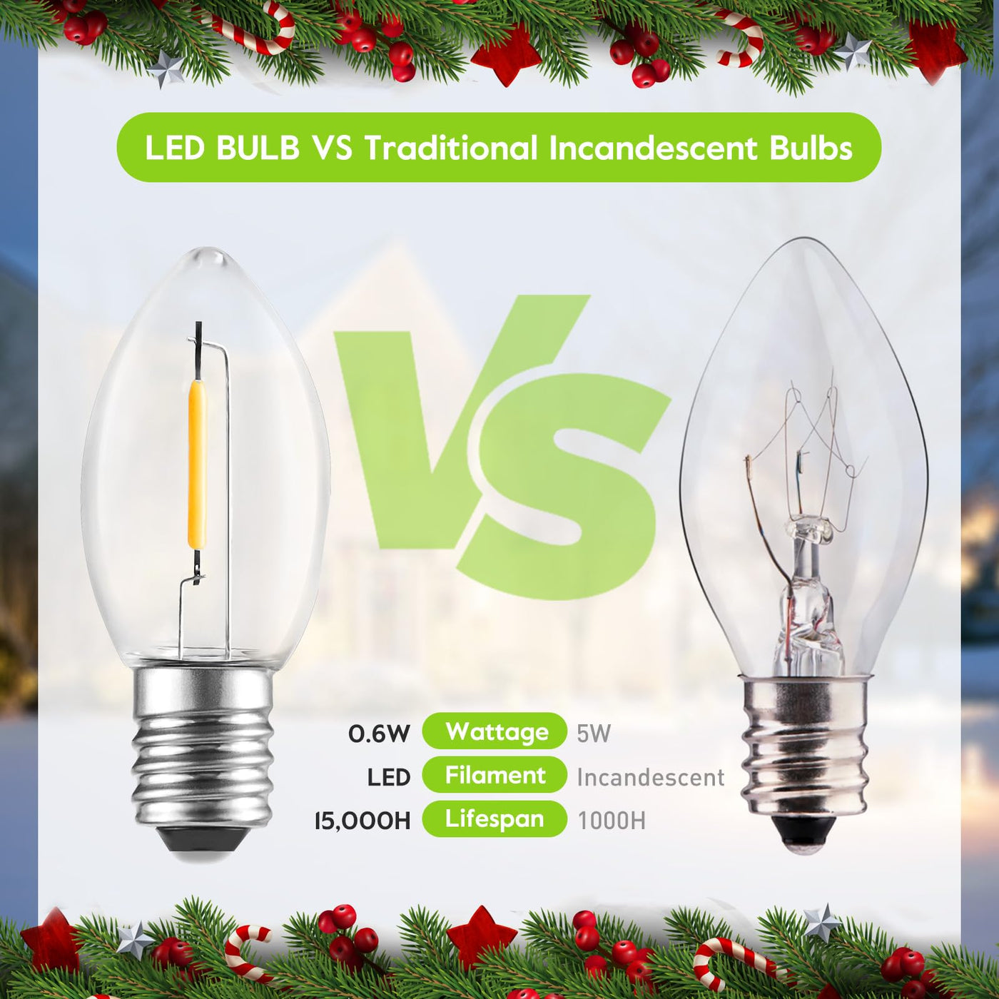 Brightown 25 Pack of Clear led C7 Transparent Christmas Lights have a bright and vibrant coloring that will provide years of use for your Christmas light display. These 1-watt, 120-volt bulbs with Candelabra base will shine for 10000 hours and have nickle-coated bases to prevent corrosion. These Clear C7 replacement lamps can be used inside or out to decorate rooflines, patios, and walkways. Candelabra base (E12) Use with all kinds of C7 stringers which comes with E12 Candelabra base(sold separately).