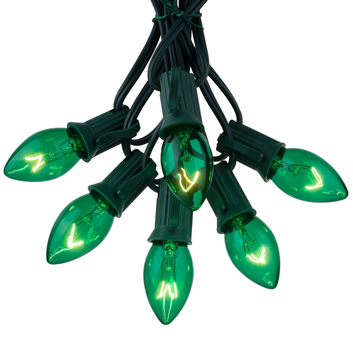 Q: How many bulbs come in a pack and what color are they?A: Each pack contains 50 green C9 incandescent bulbs, which are designed to provide a vibrant and traditional Christmas light display.