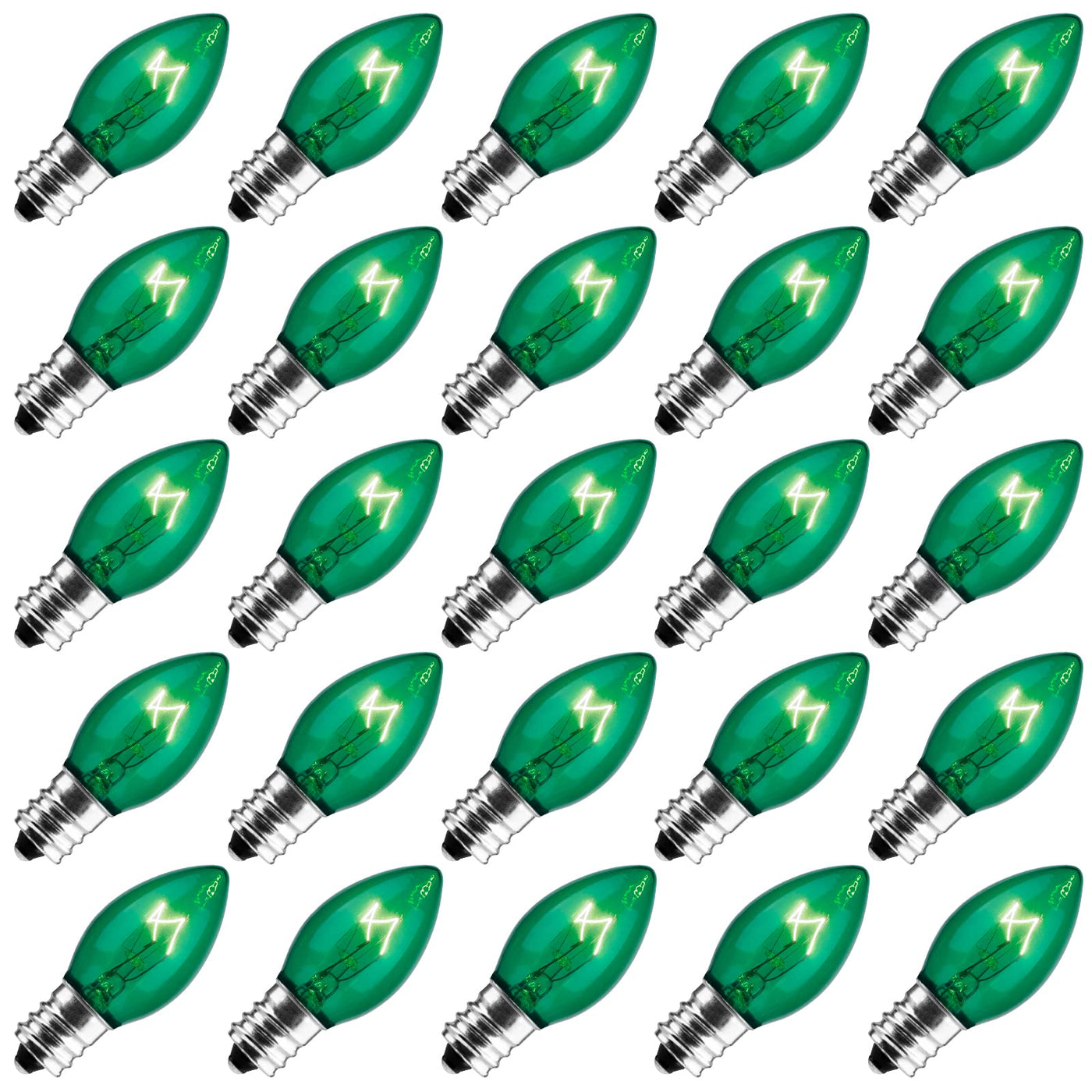 50 pack of green traditional c9 transparent Christmas lights have a bright and vibrant coloring that will provide years of use for your Christmas light display. These 7 watt, 130 volt bulbs with intermediate base will shine for 3000 hours and have nickle coated bases to prevent corrosion. These clear c9 replacement lamps can be used inside or out to decorate rooflines, patios, and walkways. Intermediate base (e17) 3 inches tall and 1 1/4 inches wide. Used with all kinds of c9 stringers which comes with e17 intermediate base(sold separately)
