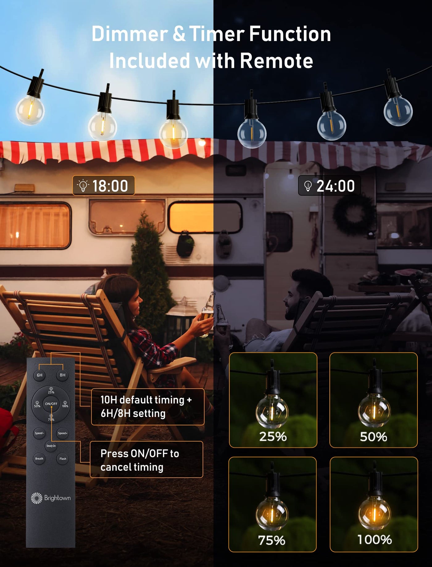 Multifunctional Remote Control: Customize your outdoor ambiance with ease! Adjust the brightness levels (25%, 50%, 75%, 100%) and light speed, set timers for 6, 8, or 10 hours, and choose from 3 lighting effects(steady on/breath/flash)—all with a simple remote. No need for extra dimmers or timers—everything you need is included | Solar & USB Dual Charging Options: These solar string lights for outside can run up to 16 hours on a full charge, absorbing energy from sunlight during the day (auto turning off at dawn and on at dusk). The 180-degree adjustable solar panel(3.5W Solar Panel/ 3600mAh Solar Powered Battery) ensures optimal sun exposure. Plus, USB charging(5V 1A/Type-C) is available as a backup, perfect for cloudy days or limited sunlight | Commercial Grade Durability: This outdoor string lights total spans 58 feet and is UL certified, 48-foot lighted length featuring 26 shatterproof LED bulbs (including 1 spare bulb), with a 9-foot power cord and 1-foot tail wire, 24 inches bulb spacing, a warm 2700k glow, making it perfect for backyard, weddings, parties, and birthdays. The included stakes and clips allow for easy installation of the solar powered outdoor lights, making it versatile for various settings; Not Connectable | Shatterproof & Weatherproof Solar Lights Outdoor: Crafted from high-quality plastic, these LED patio lights are designed to be shatterproof and IP45 waterproof. They can handle harsh weather conditions such as rain, wind, and snow, making them the perfect addition to your year-round outdoor setup | Energy-Efficient & Long-Lasting: Each bulb uses only 3V 0.15W of energy, which is 10-20 times more efficient than traditional tungsten bulbs. The C7/E12 candelabra sockets help save energy while providing a long lifespan, ensuring your outdoor lights keep shining for years to come | Easy Installation for Indoor & Outdoor Use: Whether you're decorating your patio, garden, or commercial space, these hanging lights are quick and simple to hang with included cable ties (Includes 30 cable ties and 26 hooks). Ideal for a wide range of applications—backyard, fence, wedding, party, cafe, patio, yard, window, garden, deck, pool, canopy, porch, pergola, tent, camping, gazebo, booth, bistro, bar, pub, cafe, restaurant, hotel, mall, Christmas decorations | Tips: For Bulbs replacement, please search B0BXWD9NLK (3V 0.15W G40 solar replacement bulbs)