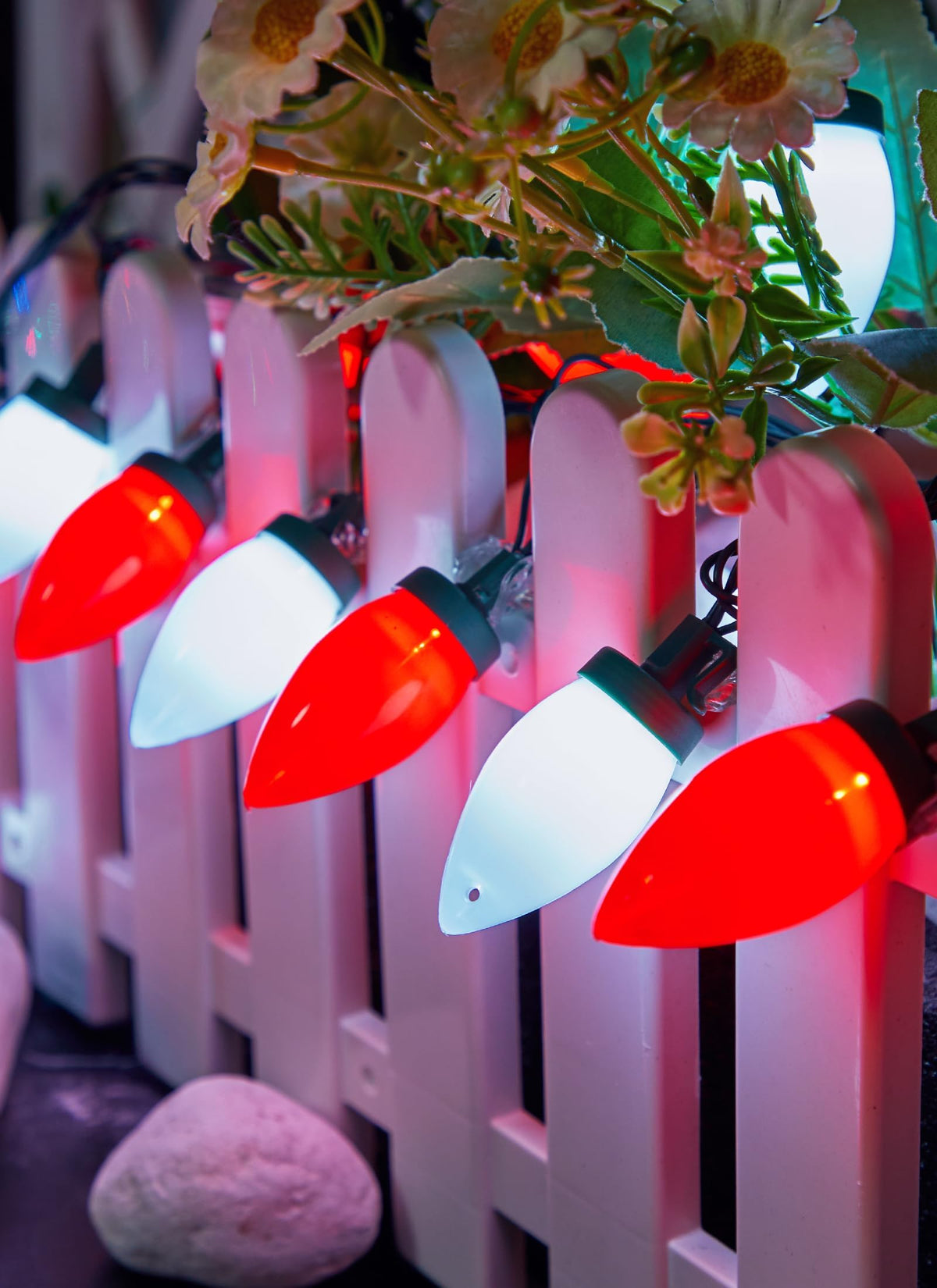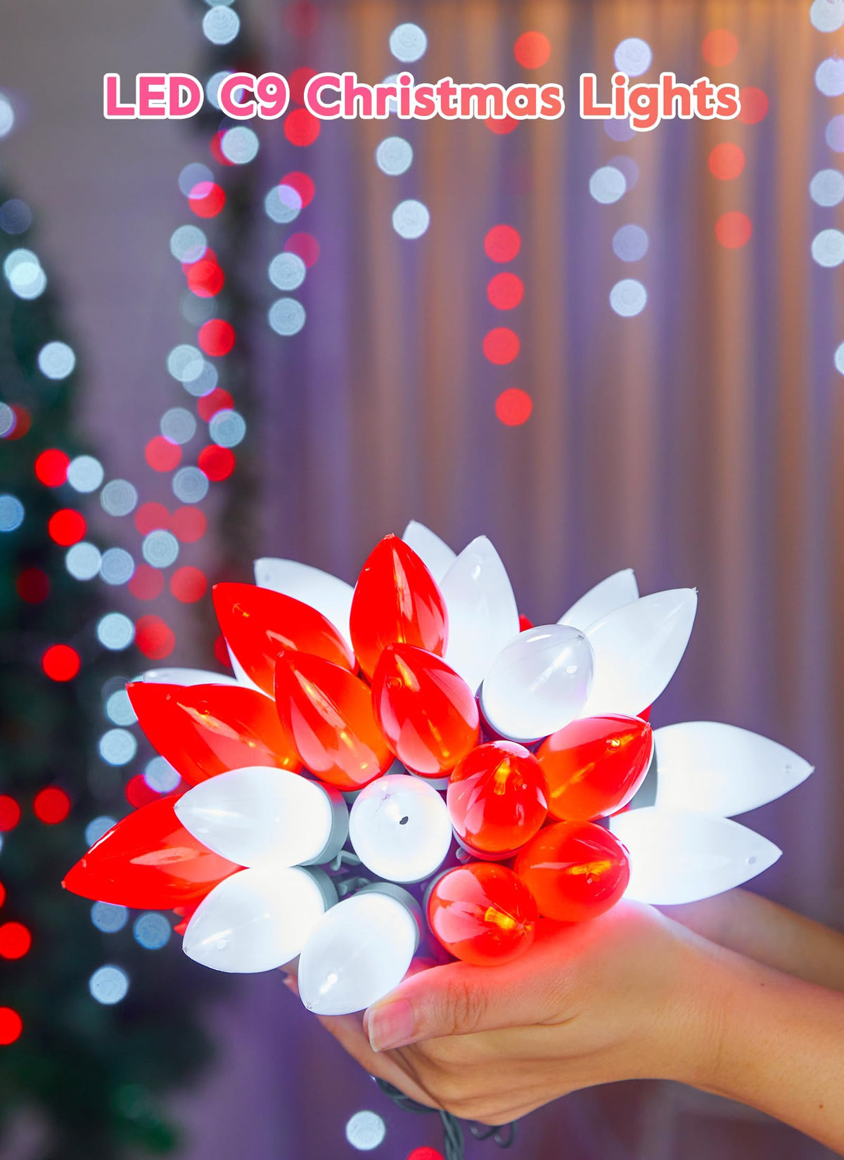 Q: What colors are the bulbs and how do they enhance my holiday decor?A: The Brightown C9 Christmas lights feature opaque red and white bulbs that provide a vintage classic holiday look. The vibrant colors and smooth finish create stunning lighting effects, enhancing the festive atmosphere for your Christmas and holiday celebrations.