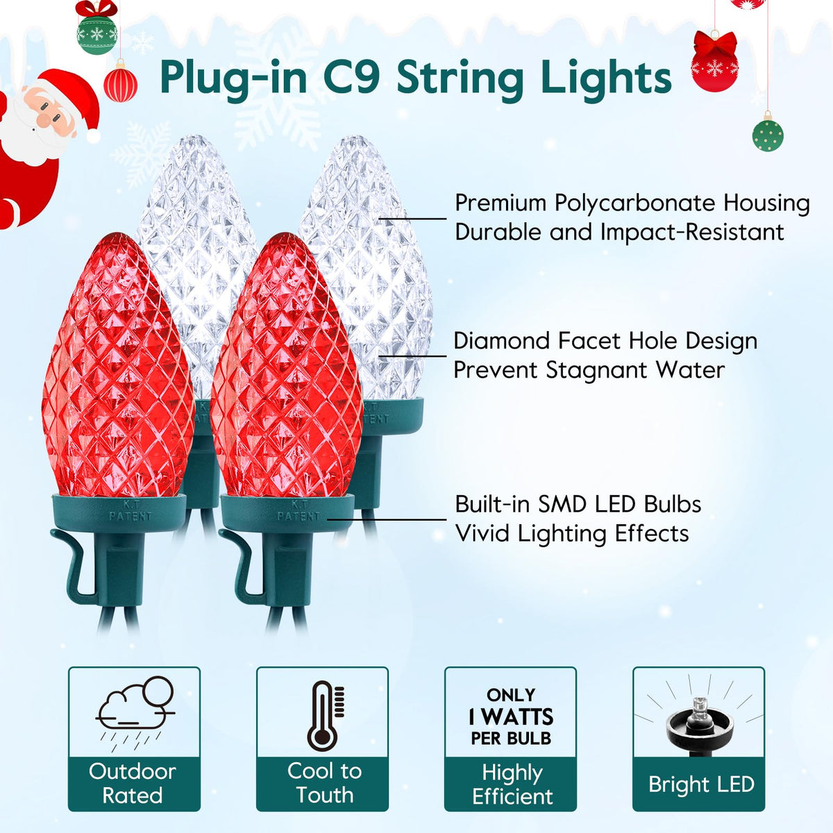66 Ft Plug-In C9 Led Christmas String Lights - Decorate A Cheerful Christmas ? The Plug-In C9 Green Wire Lights Are 66 Feet Long With 100 Bright Strawberry-Shaped Leds. The Heavy-Duty Wiring And Bigger-Sized Led Bulbs Will Add A Cheerful And Romantic Touch To Your Indoor And Outdoor Space. ? You Can Connect Up To 33 Sets Of These Christmas String Lights End To End, Which Is Incredibly Convenient For Decorating Vast Areas Or A Sizeable Outdoor Object - Such As Your Roofline Or An Oversized Tree. ? Take These Lovely C9 String Lights To Explore A Fascinating Christmas Season. It Is Ideal For Christmas Trees, Rooflines, Fences, Porches, Yards, Patios, Etc. Features ? Plug-In Power Supply Ensure Super Bright Glow ? 100 Energy-Efficient Shatterproof Plastic Led Bulbs ? 66-Foot-Long Durable Heavy-Duty Green Wire ? Ability To Connect Up To 33 Strands To Decorate Larger Space ? Ip44 Waterproof For Indoor And Outdoor Use ? Built-In Clips For Easy Hanging ? Super Long 20,000-Hour Lifespan Specifications ? Bulb Type: Led Bulb ? Bulb Quantity: 100+2 Bulbs ? Bulb Lifespan: 20,000 Hours ? Bulb Spacing: 8 Inches ? Cord Length: 66 Feet ? Leading Wire: 24 Inches ? Waterproof Rating: Ip44 ? Connectable: Up To 33 Strands ? Power Source: Plug-In Package Included 1 ? 66 Ft Plug-In C9 Led Christmas String Lights 2 ? Replacement Bulbs 2 ? Spare Fuses 1 ? User Manual