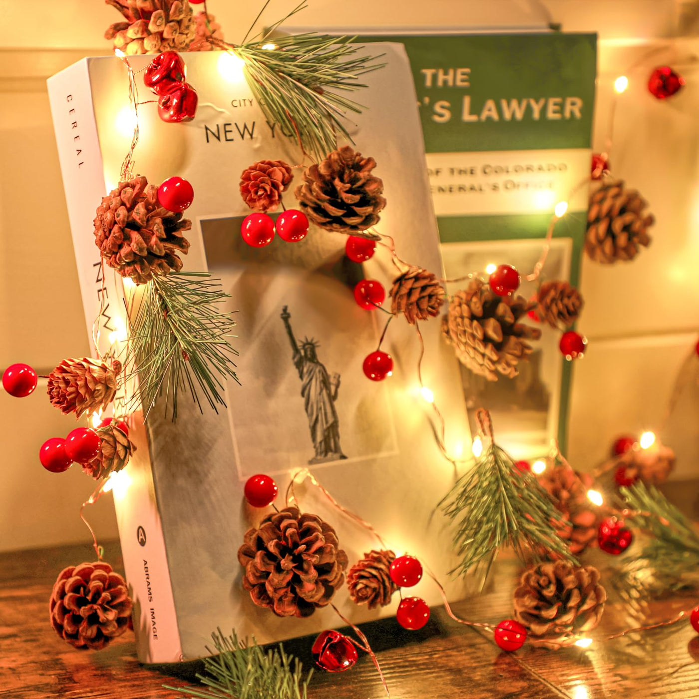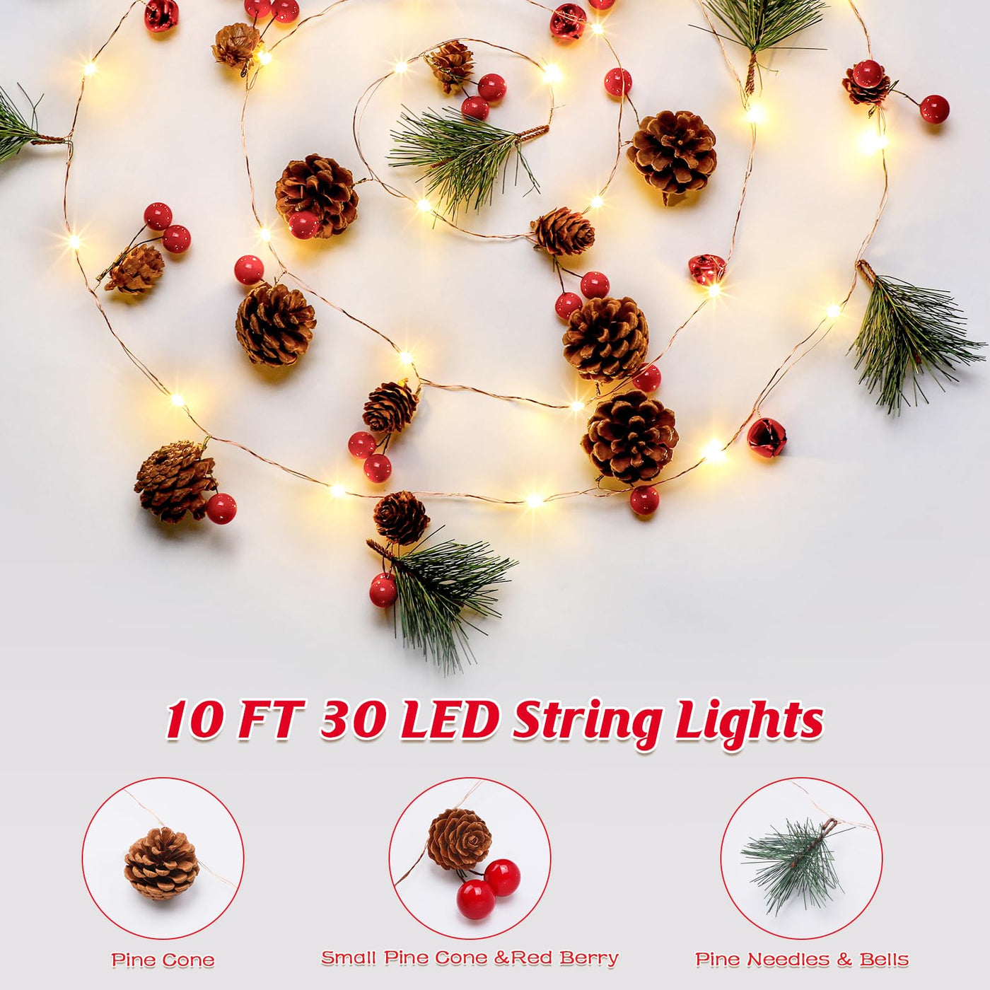 Brightown Christmas Pine Cone String Lights, 30 Led Battery Operated Garland String Lights With Red Berry Pine Cone Pine Needles Bells Fairy String Lights For Indoor Outdoor Christmas Decorations