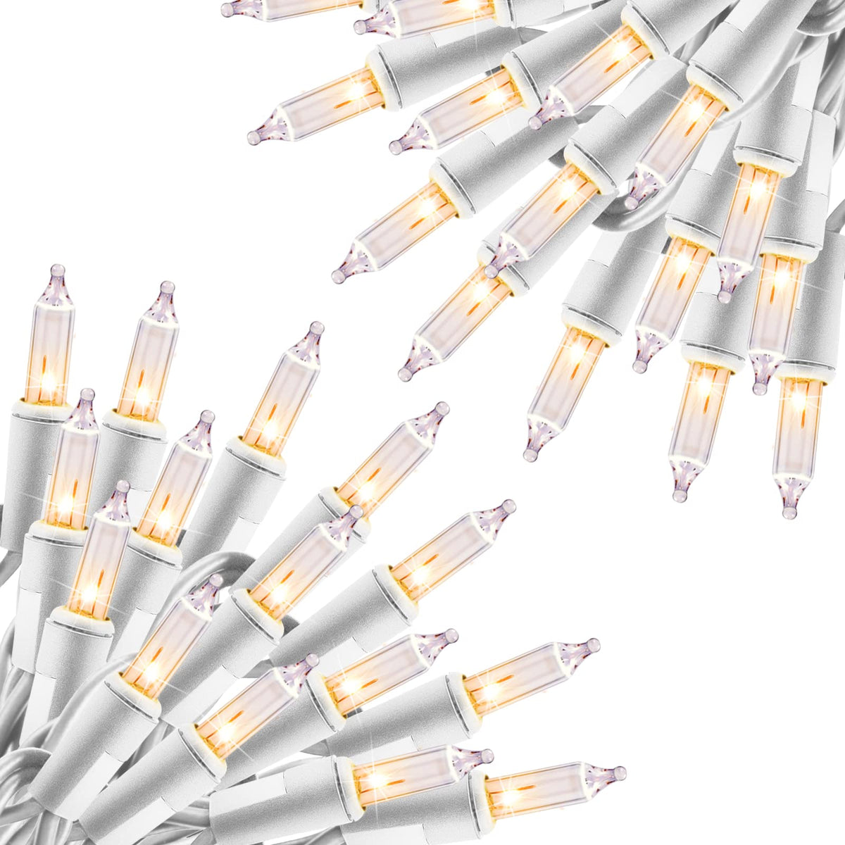Value light string set includes 100 clear mini lights, 26.5 feet white wire, and each bulb is 3 inches apart. Can be connected end-to-end, extending the connection to meet different decoration needs. Built-in fuses are UL listed for safe use. Complimentary 4 spare bulbs and 2 fuses. Eye protection warm white light design, can be both illuminated and decorated well. Standard grade mini light string with average lifespan of 3,000 hours. Independent lighting, when one bulb is turned off, the other bulbs will not be turned off.