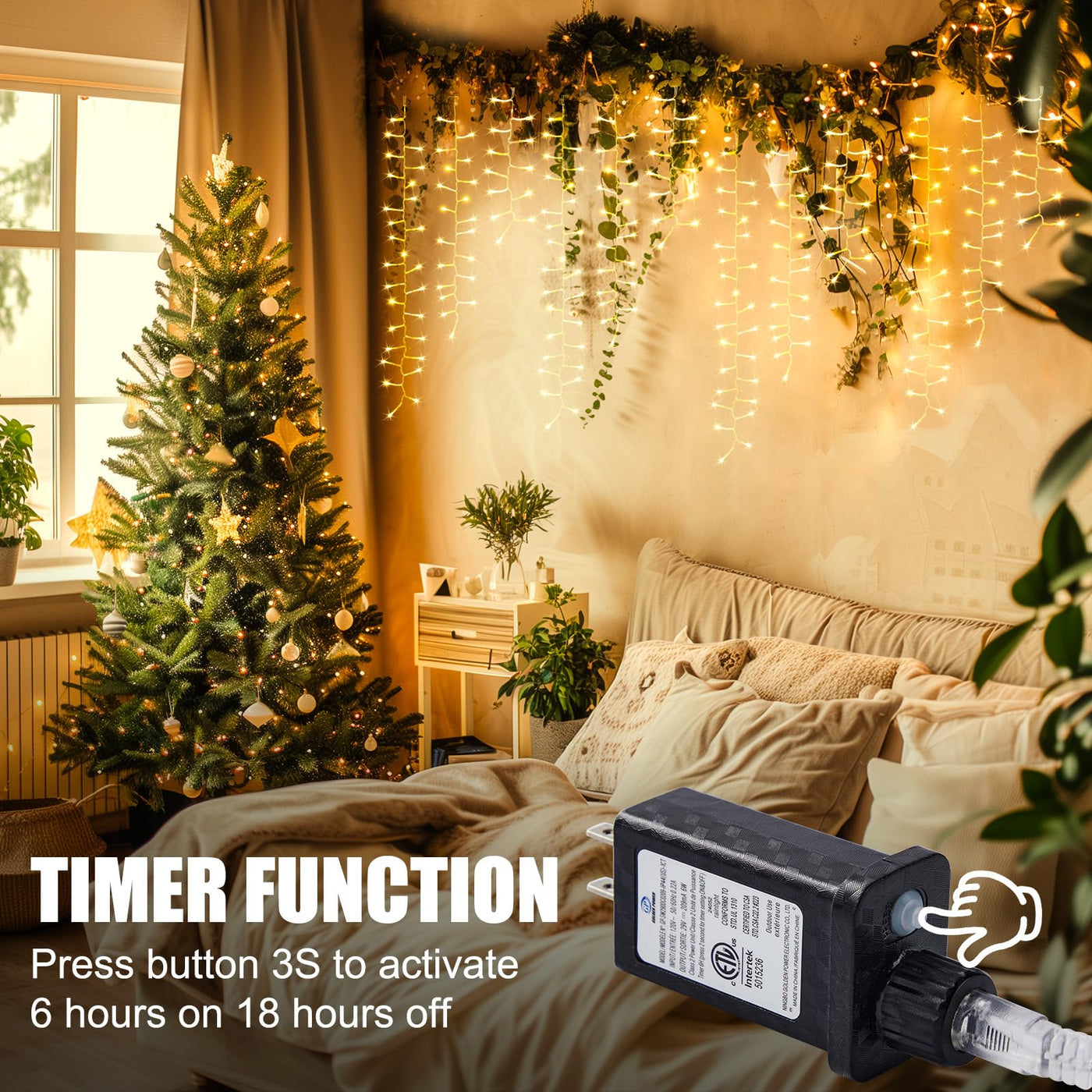 Q: What is the timer function and how does it work?A: The timer function allows you to set the lights to automatically turn on for 6 hours and off for 18 hours. To activate it, press the button for 3 seconds, making it convenient for hassle-free use during the holiday season.