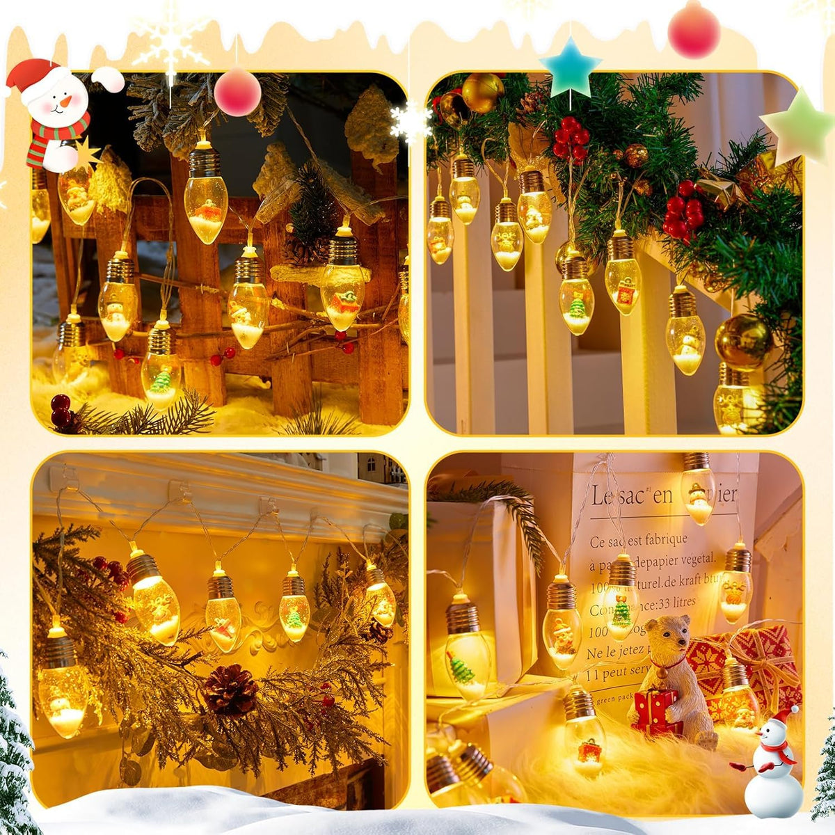 Q: How many lights are included in the string lights set?A: This set includes ten lights, each featuring charming Christmas elements such as Santa, gifts, and ornaments inside snow globes.