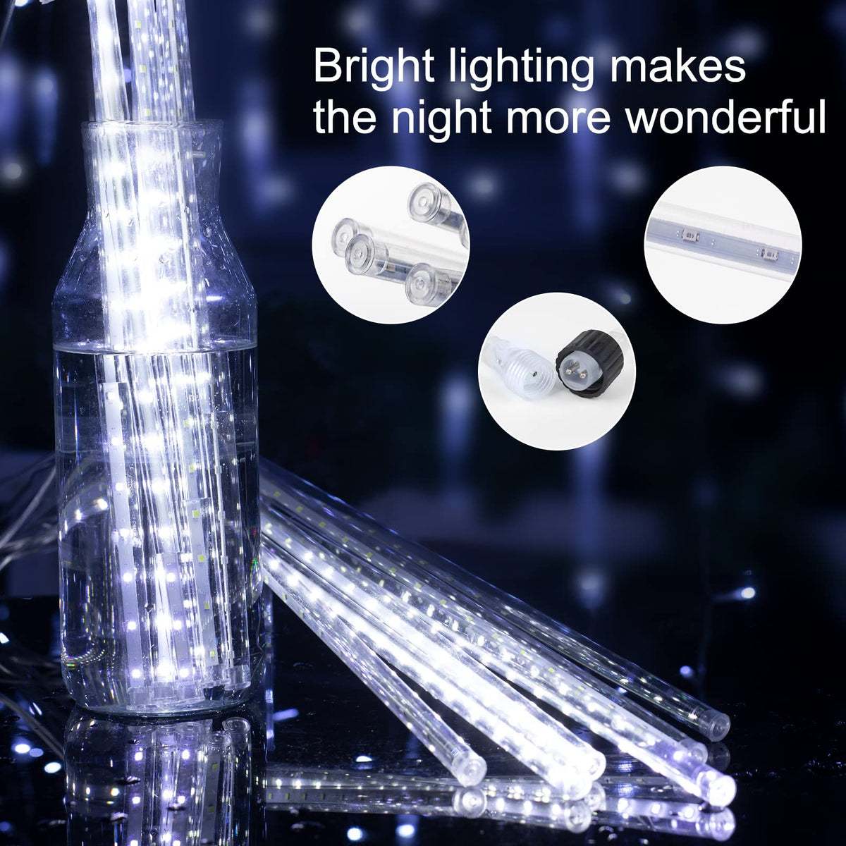 Cascading Christmas Lights, Holiday Time Decorations These Shooting Star Christmas Lights Outdoor Are A Series Of Led Lighting. It Has The Effect Of Shooting Stars Across The Night Sky. It Breaks Through The Visual Aesthetic Limit Of Traditional Lighting. They Can Be Hung On Trees, Under Houses, And On The Wall Surface. Especially Suitable For Large Scale Decoration Projects. Like Parks, Tourist Attractions, Green Belts, Etc., To Add Beauty To Life. Product Features: White Icicle String Lights Meteor Shower Effect, Romantic And Beautiful High Brightness Meteor Christmas Lights, Pure Color, High-Brightness Without Light Spots, Can Achieve Realistic Meteor Effects Easy To Install, Dustproof, And Anti-Leakage. And Use A Rigid Pcb Circuit Board, Including An Integrated Circuit Program To Make The Dripping Icicle Lights Like A Meteor Falling On The Moon, The Light Is Naturally Smooth The Shell Is Durable, Does Not Change Color, Does Not Change Shape, Environmental Protection And Waterproof, And The Waterproof Of The Rain Drop Christmas Lights Is Ip65 Noted: The Plug Is Not Waterproof So Please Keep The Plug Away From Water Please Make Sure The ''+'' &''-'' Connectors Are Connected Correctly. If The Light Won'T Come On, Try To Disconnect Them And Change Another Direction To Connect Them Again Specifications: Led Type: Smd 2835 Led Tube Quantity: 16 Tubes Led Quantity Of Per Tube: 36 Led Led Quantity: Totally 576 Pieces The Length Of Leading Wire: 13.1 Feet The Length Between Tubes: 19.7 Inches The Length Of Tail Line: 7.9 Inches Power Consumption: 1.5 Watts Per Set Number Of Connections: Up To 2 Sets