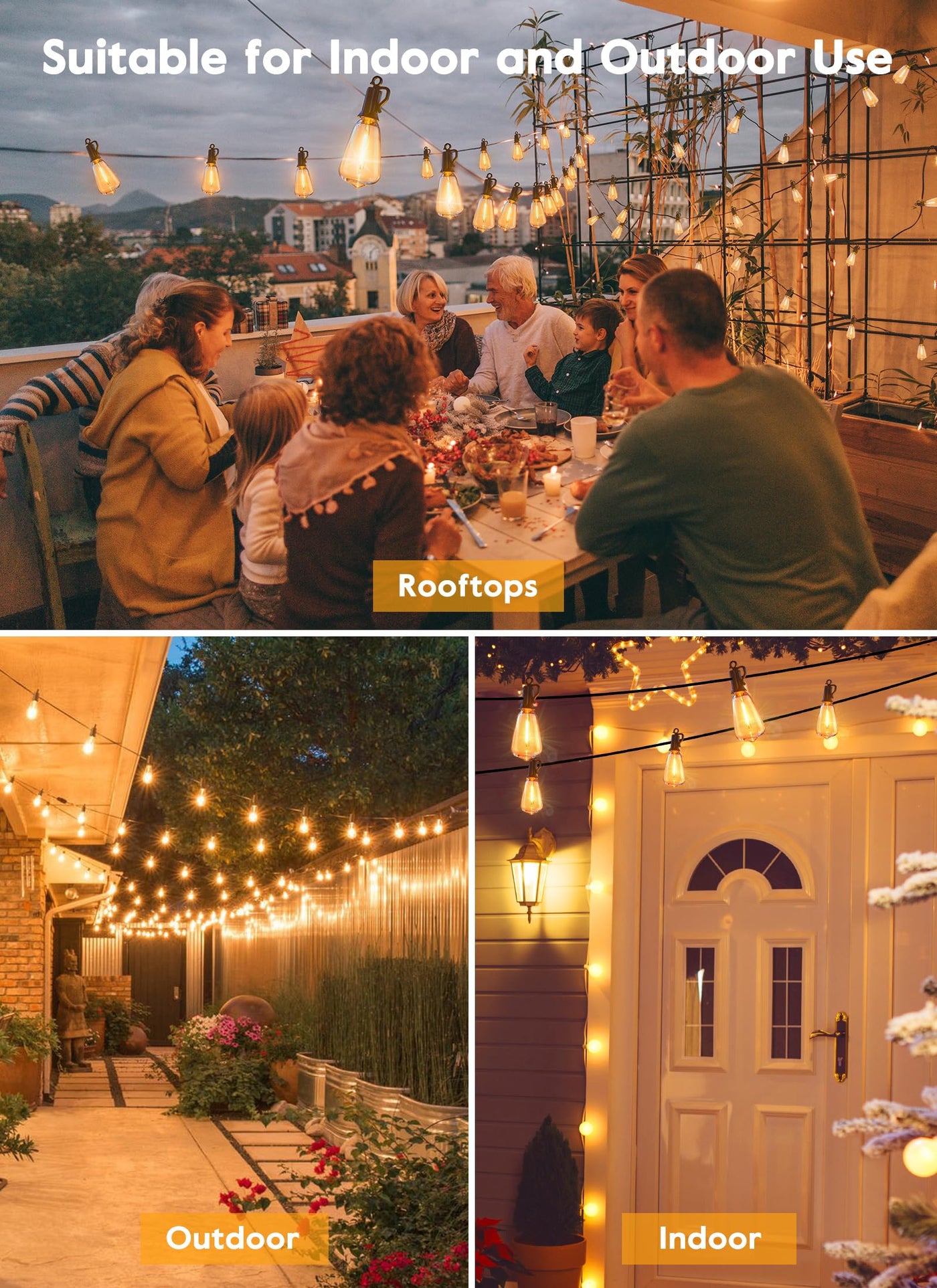 About Us We are committed to providing consumers with superior and durable lights. We attach great importance to product quality, and all products have undergone several rigorous tests to ensure durability. We believe our products and services can bring you an excellent purchasing experience. Why Choose Our LED String Lights? 1) 100ft length 2) Easy to install 3) Indoor & outdoor 4) Shatterproof plastic 5) 10 strands can be connected 6) Energy saving and high efficiency Premium Materials The bulb shell is made of superior PET, cold-resistant, flame-retardant, and UV-resistant, providing excellent durability. The transparent optical shell makes the light more uniform and natural. Eye-Protecting LED 2700k warm white outdoor string lights have no radiation no frequency flash, effectively protecting your eyes and enhancing the night lighting atmosphere for your family and friends. Excellent Gift This decorative light is suitable for home use and is ideal for Christmas, Thanksgiving, birthday gifts. It is an excellent gift to surprise your family, friends, and neighbors. Tips 1. There is a built-in spare fuse in the plug for easy replacement. 2. Ensure that your replacement bulb fits securely into the bulb socket. 3. The dimmer is not included in the package. Specifications Bulb Specification: PET Bulb Quantity: 50pcs LED Bulb x 2 power: 0.6W Length: 2ft Product size: 1*1*2ft Waterproof grade: IP44