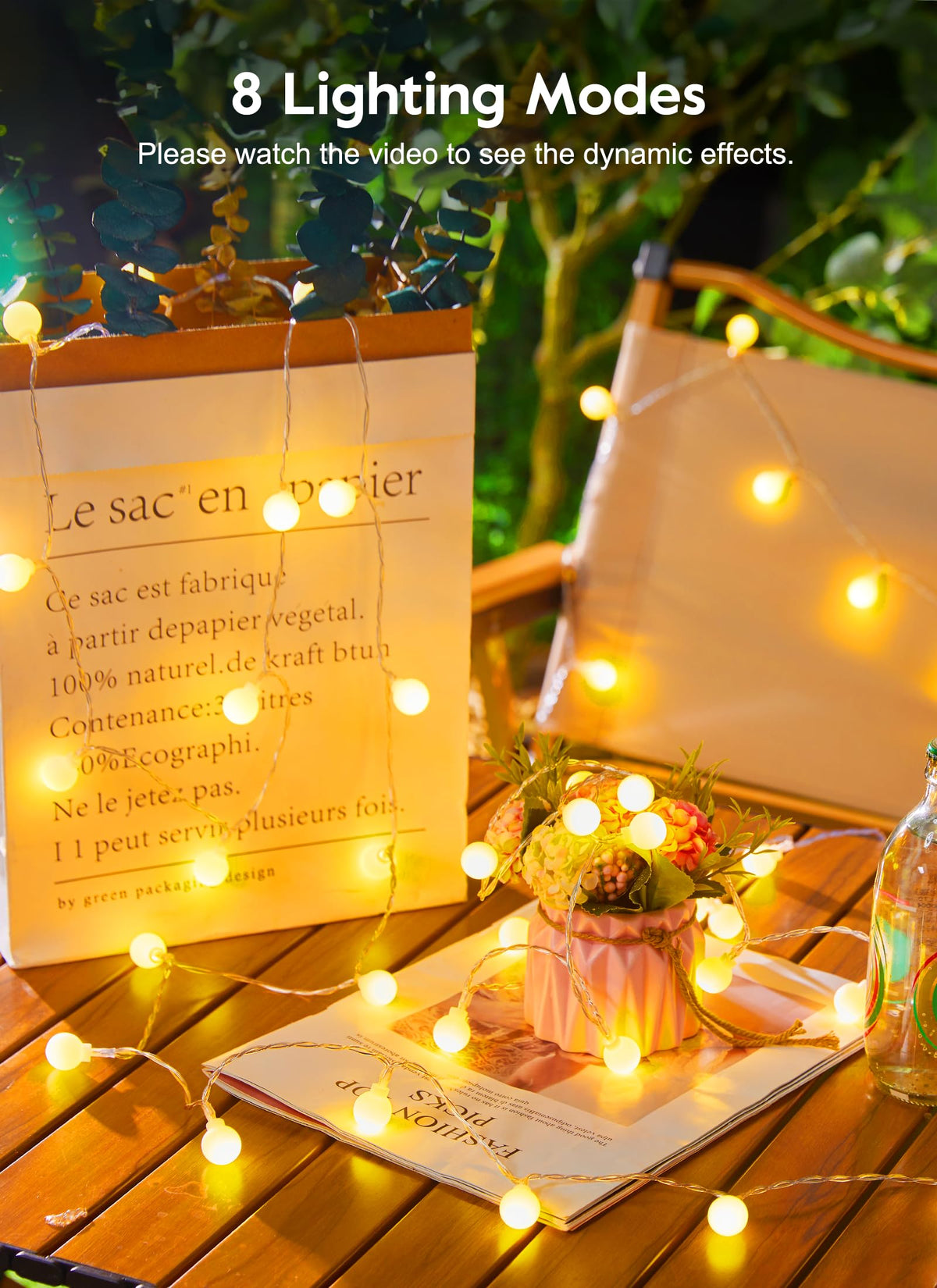 Q: What are the different light modes available for these solar fairy lights?A: The solar fairy lights feature 8 different light modes including combination, in waves, sequential, slow glow, chasing/flash, slow fade, twinkle/flash, and steady-on, allowing you to create the perfect ambiance.