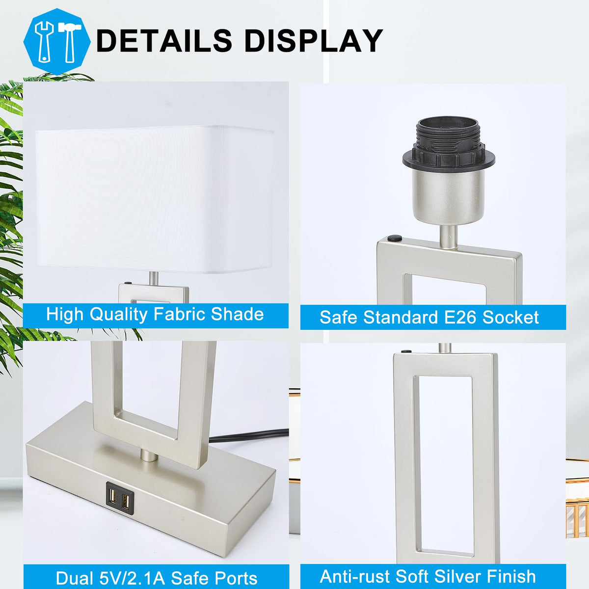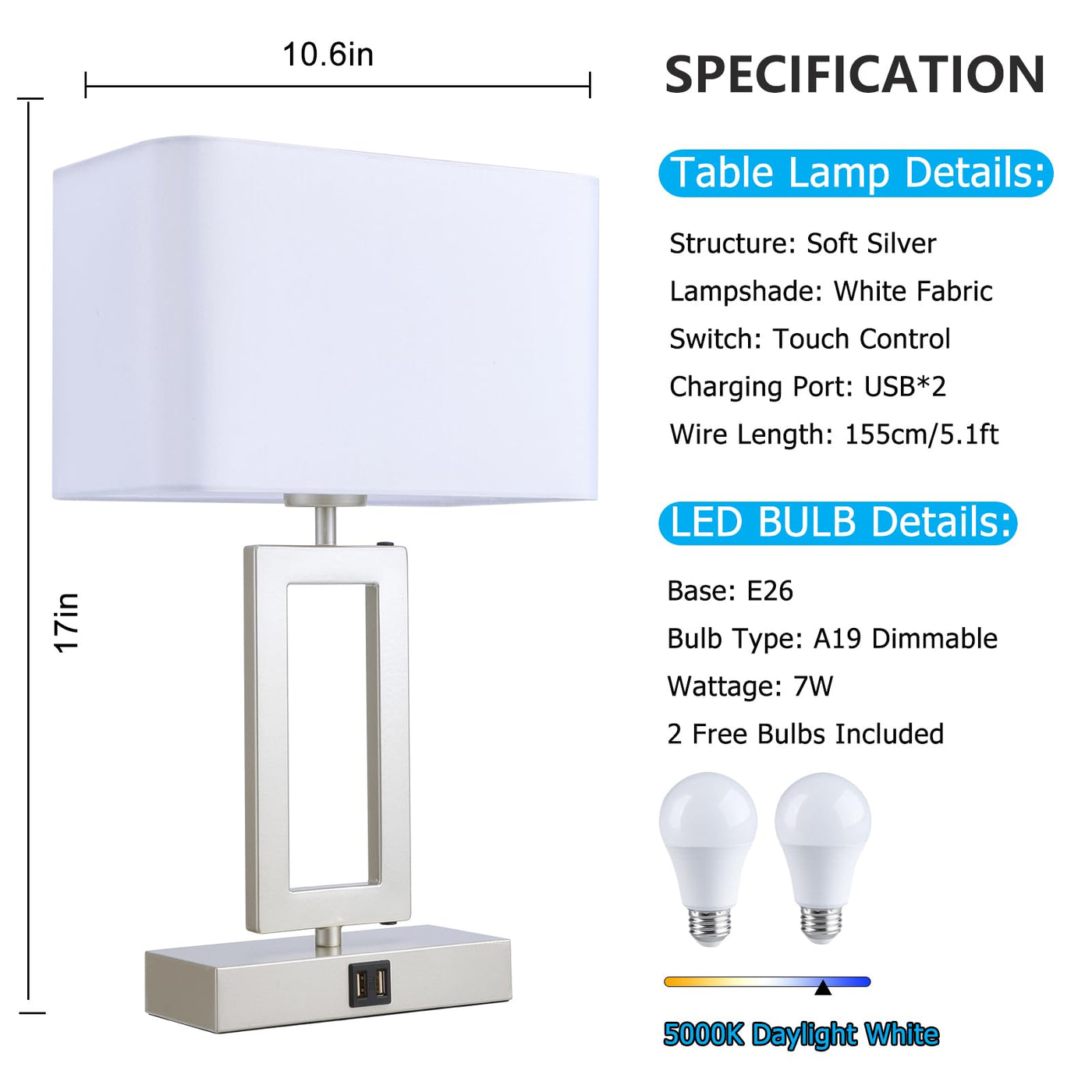 Q: What are the main features of the BrightWe Table Lamp Set?A: The BrightWe Table Lamp Set features a classic style with a soft silver pole and rectangle fabric lampshades. It includes touch control for easy operation, three-way dimmable brightness settings, dual USB charging ports for simultaneous device charging, and two LED bulbs that are energy-efficient with a long lifespan.