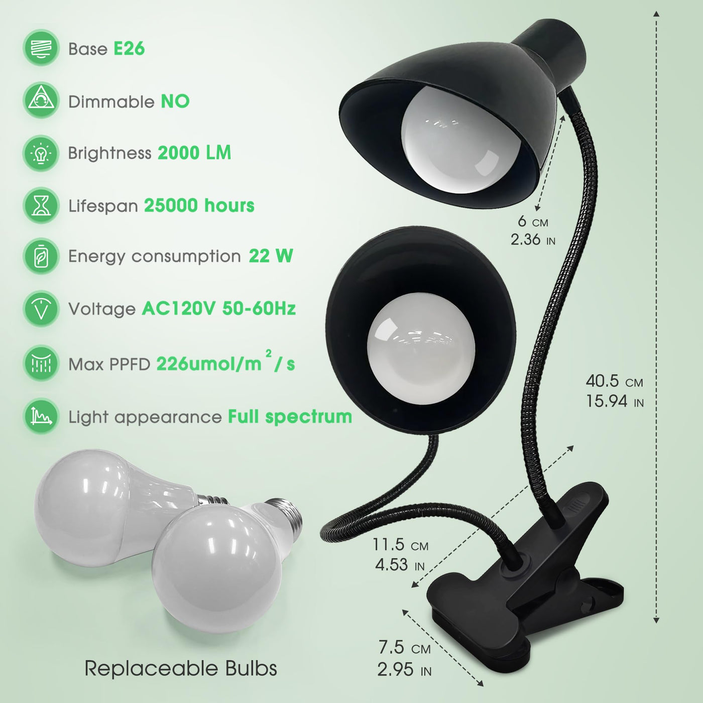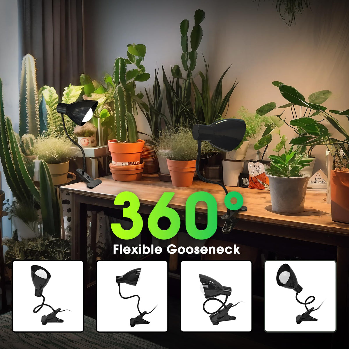 Strong Clip and Flexible Gooseneck Featuring a robust clip, this grow light can be securely clamped in various positions, making it versatile for any indoor setting. The adjustable gooseneck allows for precise lighting angles and heights, enabling you to tailor the light exposure to your plants’ needs. Perfect for home or office use.