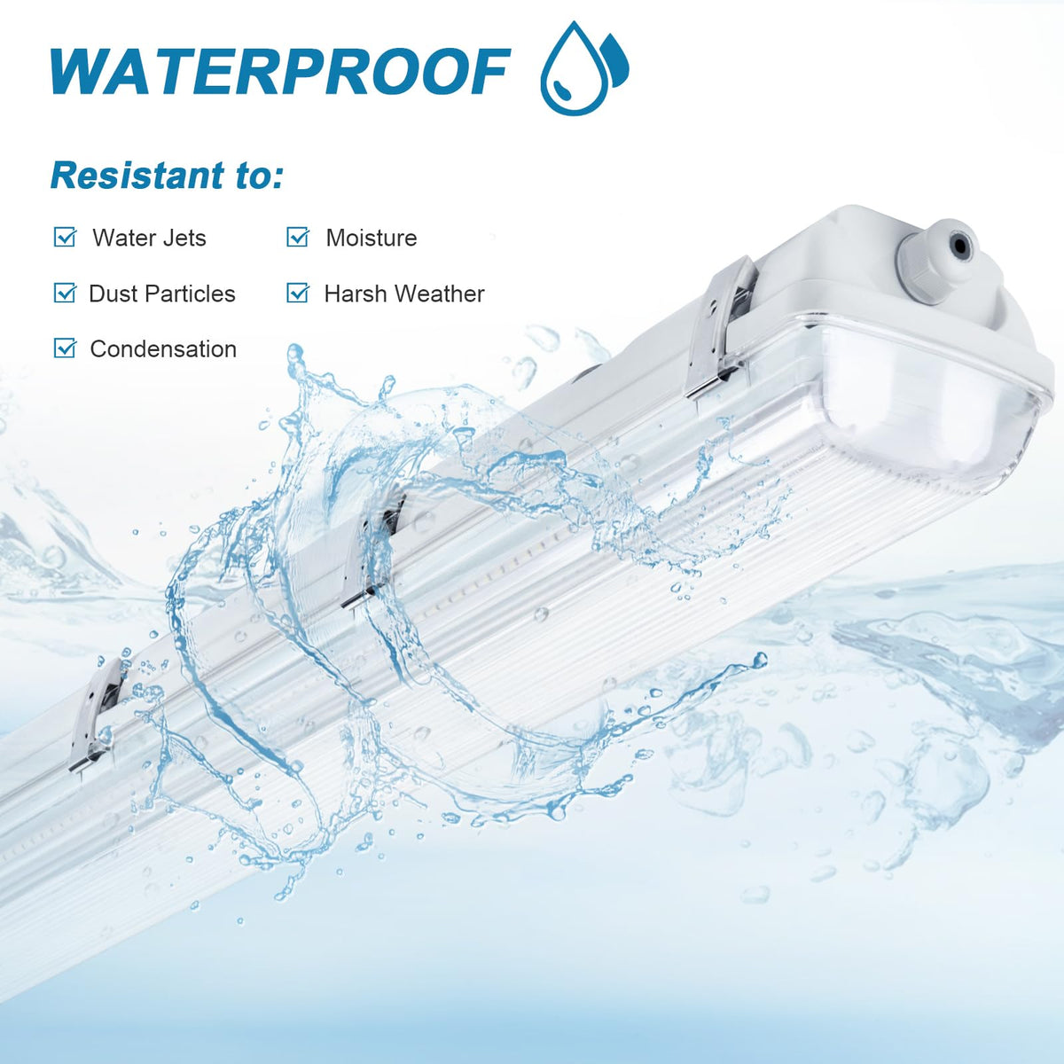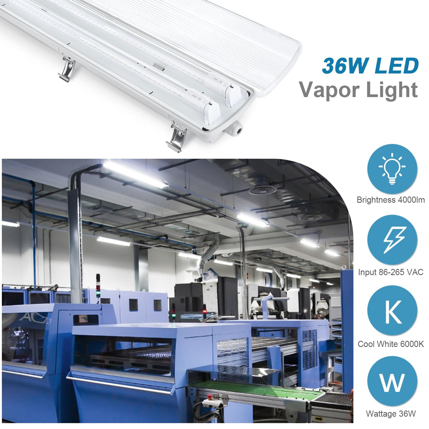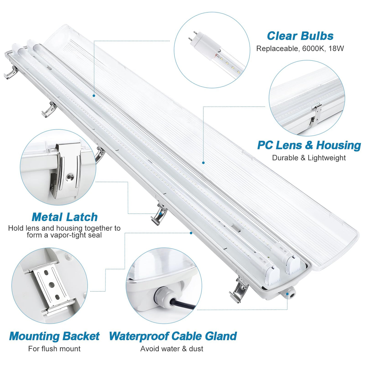- **Replaceable Bulbs**: Each fixture includes two 18W LED 4ft T8 light tubes, providing a bright 6000K cool white light output of up to 4000 lumens, perfect for illuminating larger spaces.