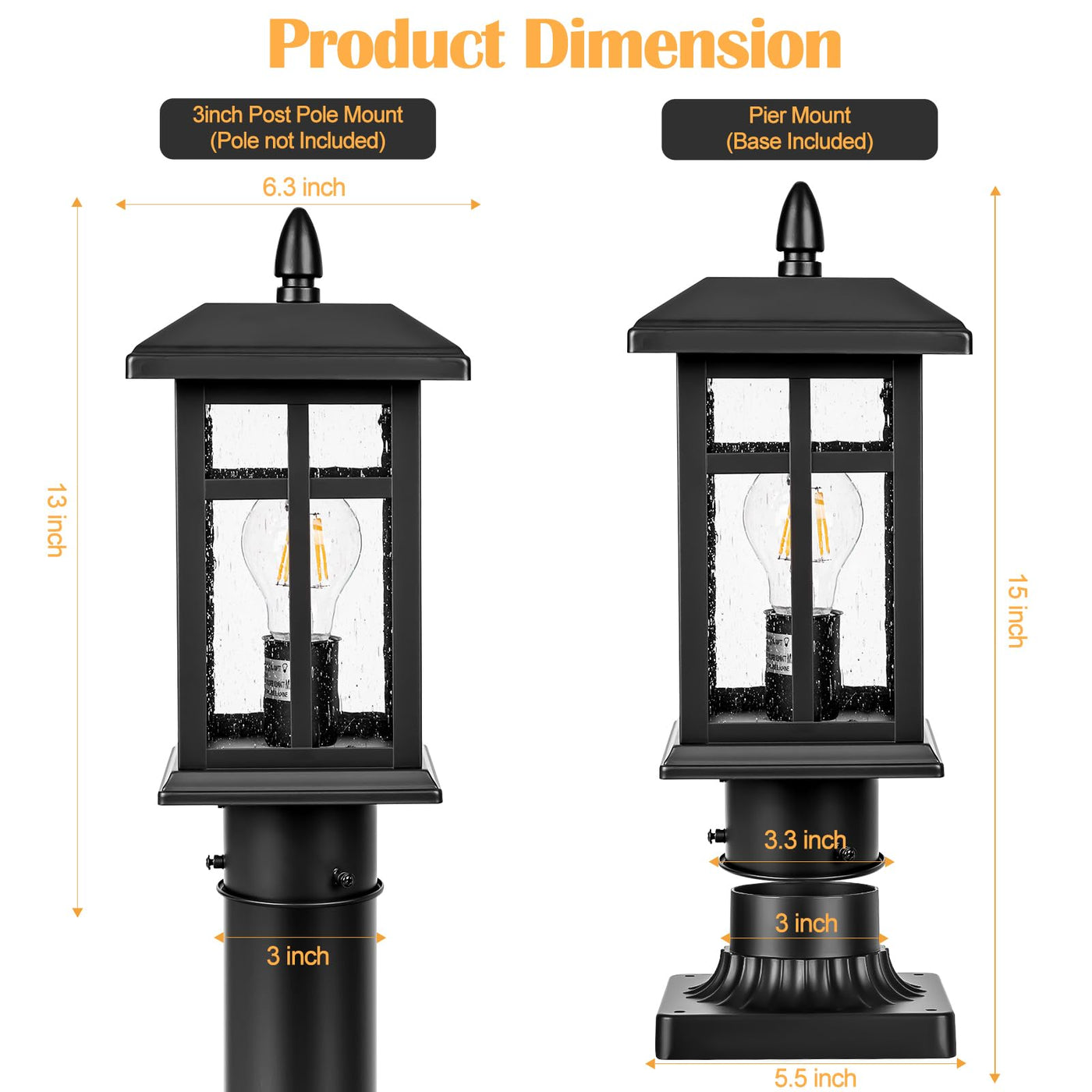 2 Packs Outdoor Post Light, Black Pole Lantern Lighting Fixture with Pier Mount Base, Exterior Lamp Post Lantern with Glass for Garden Yard Patio Path