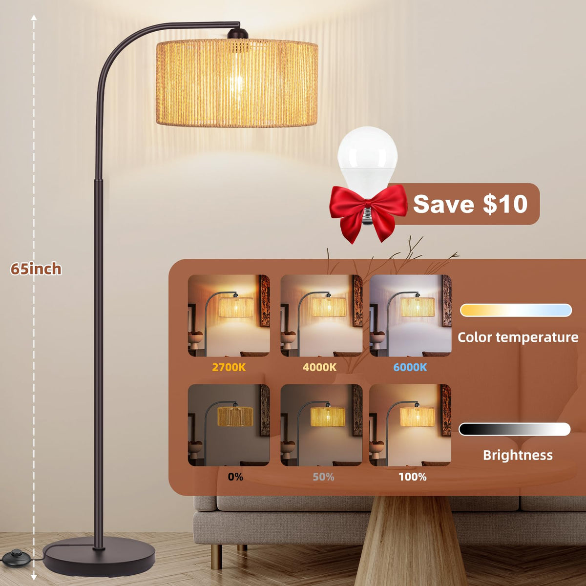 Q: What type of bulb does the Brilvibera Boho Floor Lamp use?A: The Brilvibera Boho Floor Lamp comes with a 9W LED bulb, which is energy-efficient and equivalent to a 60W incandescent bulb, helping you save up to 90% on energy costs.