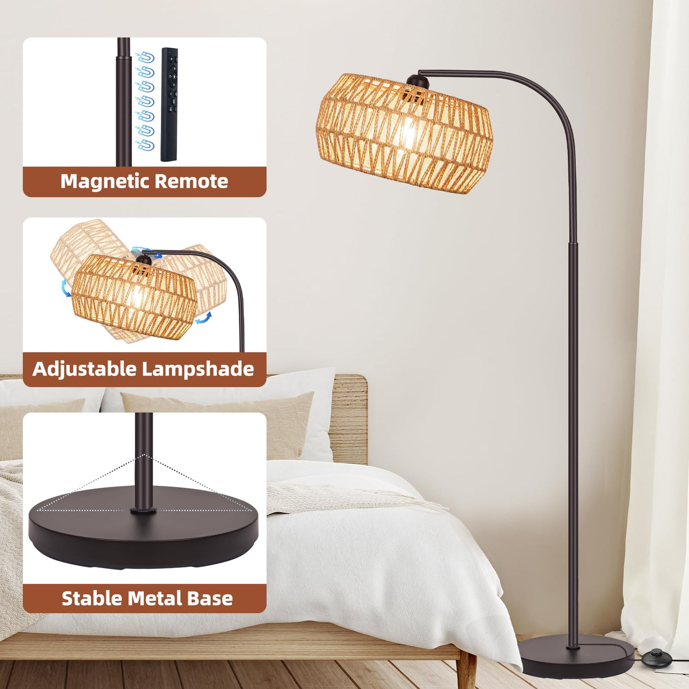 Brilvibera Rattan Standing Lamp With Remote And Dimmable Bulb, Bronze Arch Floor Lamp, Over Couch Lamp With Foot Switch, Brown Boho Lamp For Living Room, Bedroom, Office, Classroom