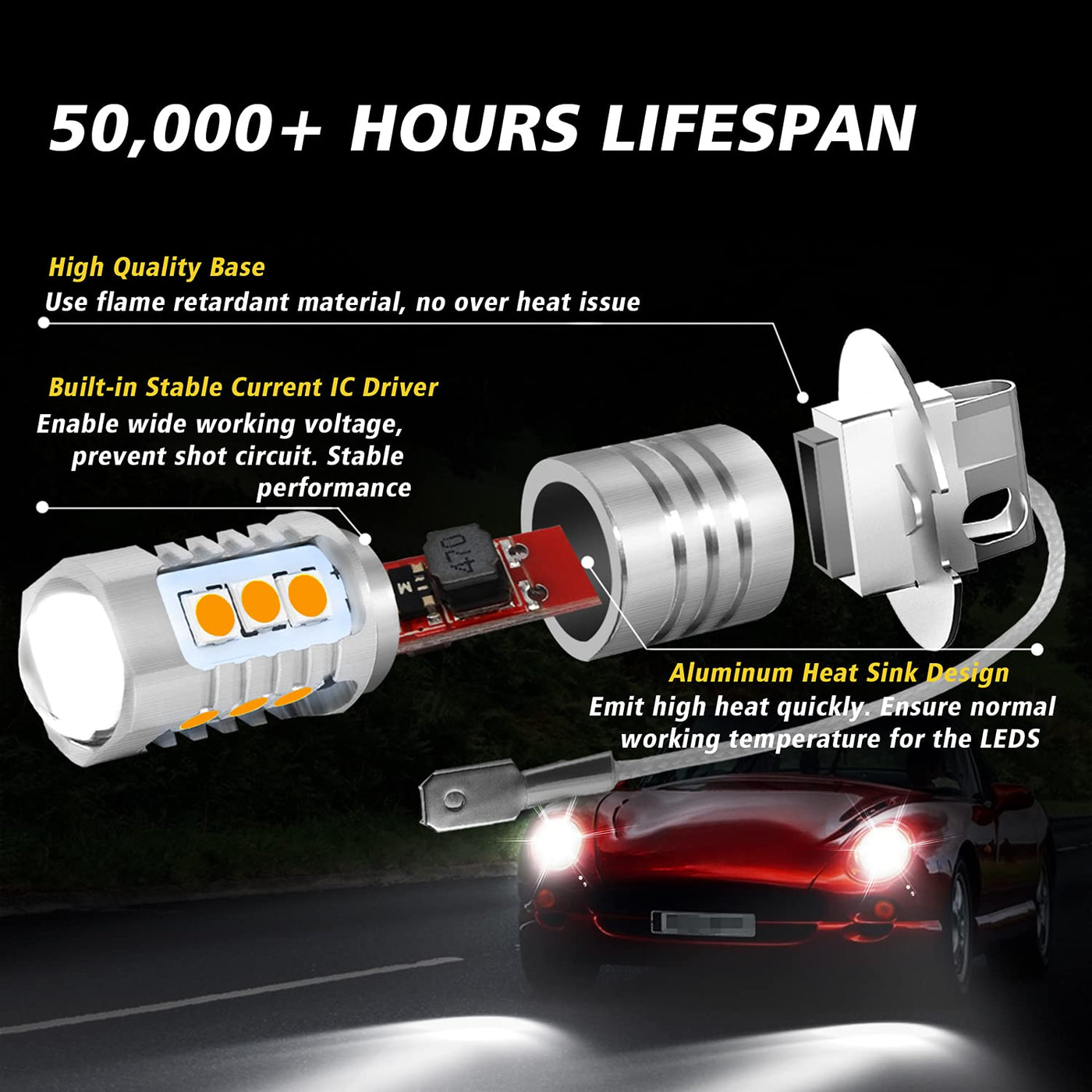 Q: What is the expected lifespan of the BRISHINE H3 LED Fog Light Bulbs?A: The BRISHINE H3 LED Fog Light Bulbs are designed to last over 50,000 hours, significantly longer than traditional incandescent bulbs, which typically last around 20,000 hours. They are built with a constant-current driving IC and aviation aluminum for efficient heat dissipation.