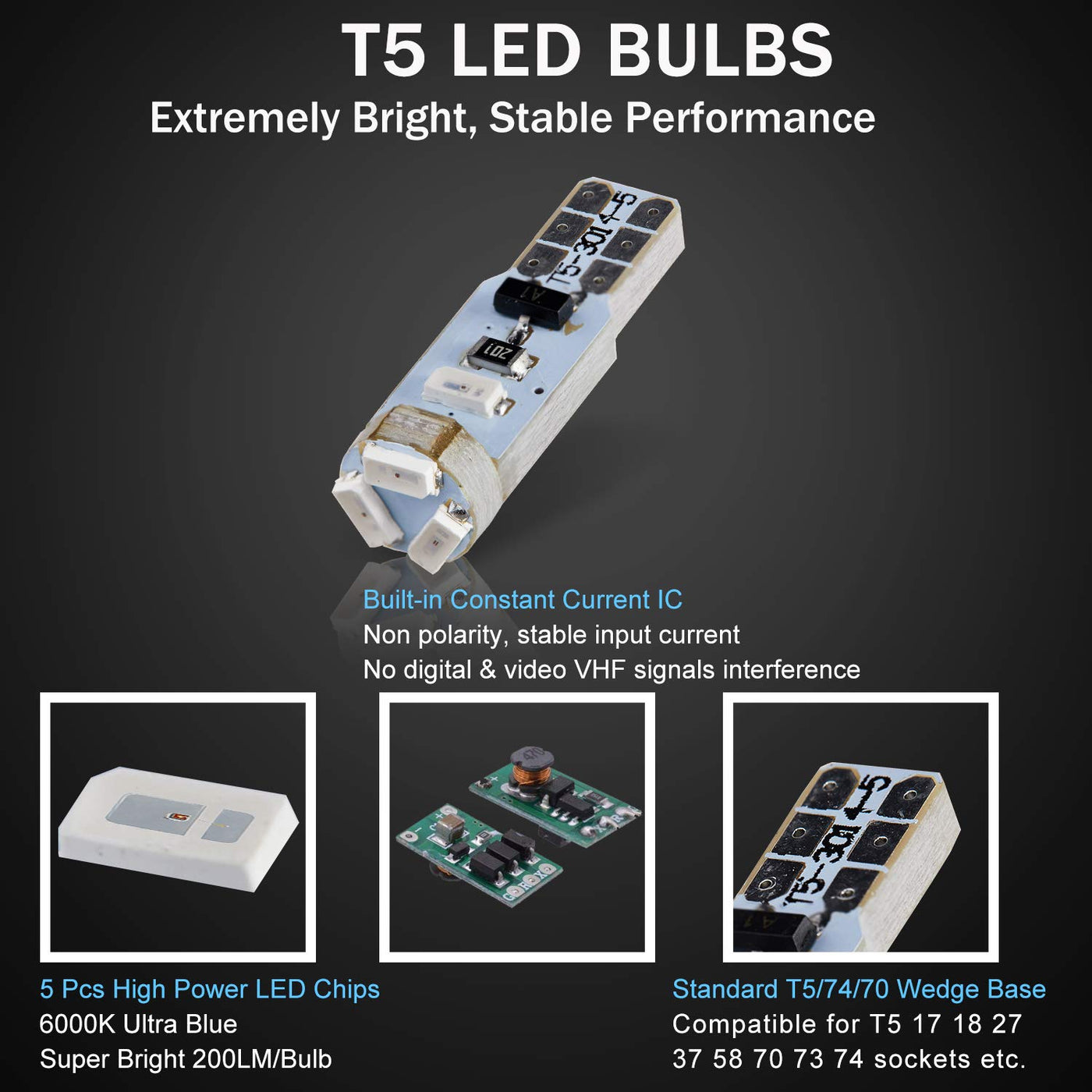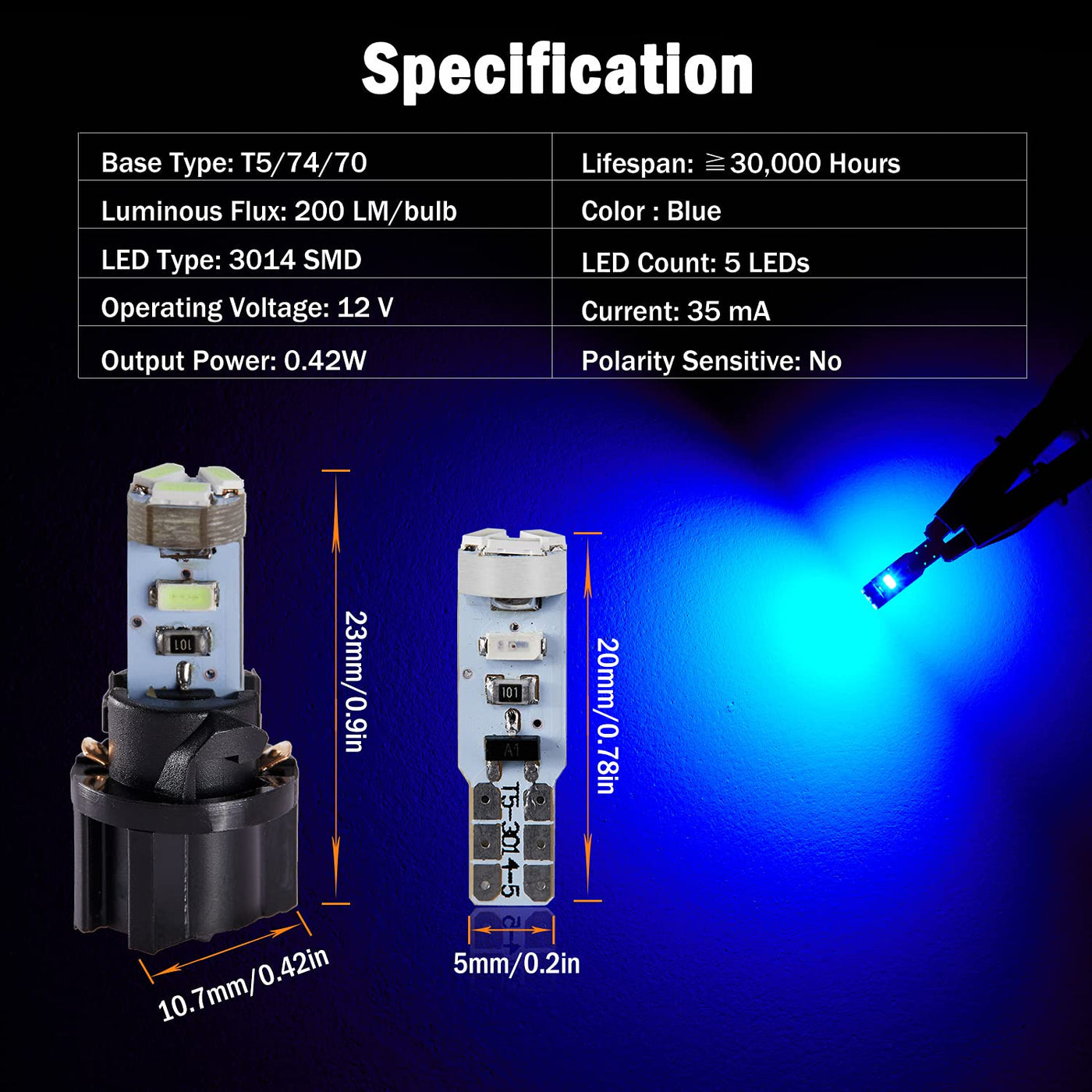 Features: -Easy installation as a direct replacement bulb -Ultra Bright LED, unique and more vivid color -Faster response time, no incandescent delay. -The LEDs will not burn your stock wires nor melt the lamp covers. -Low temperature, low power consumption, & long-lasting life up to 30,000 + hours. Specifications: Bulb Type: T5/74 Socket Lumen: 300LM/bulb LED Lifetime:30000+Hours Color: Ultra Blue LED Quantity:5 LEDs LED Type:3014 SMD Output: 0.42 Watts Operating Voltage: 12V Cross Reference: T5 17 18 27 37 58 70 73 74 79 85 86 206 207 286 306 307 308 406 407 2721 PC74 PC37 PC118 882 etc. Application: interior light, dashboard light, instrument panel light, gauge cluster indicator light, map dome light, license plate light, trunk/cargo light, door courtesy light, speedometer light, odometer light, tachometer light, check engine light, air conditioning indicating light, center console light, vanity mirror light, glove box light, side light etc. Package Includes: T5/74 LED light bulbs *10 PC74/PC37 twist lock sockets*10 Notes: Amazon filter system may not be 100% accurate, the bulb size may vary between trim of your vehicle. Please double check owners manual or original bulb number to confirm before placing an order. BRISHINE is a professional large-scale manufacturer of all types of LED lighting products and HID lighting products, integrating development and production together. We have many years of history in the auto light field. All our items are covered by 1-Year warranty and we offer friendly 24h customer service, please feel free to contact us if there is any question or request.