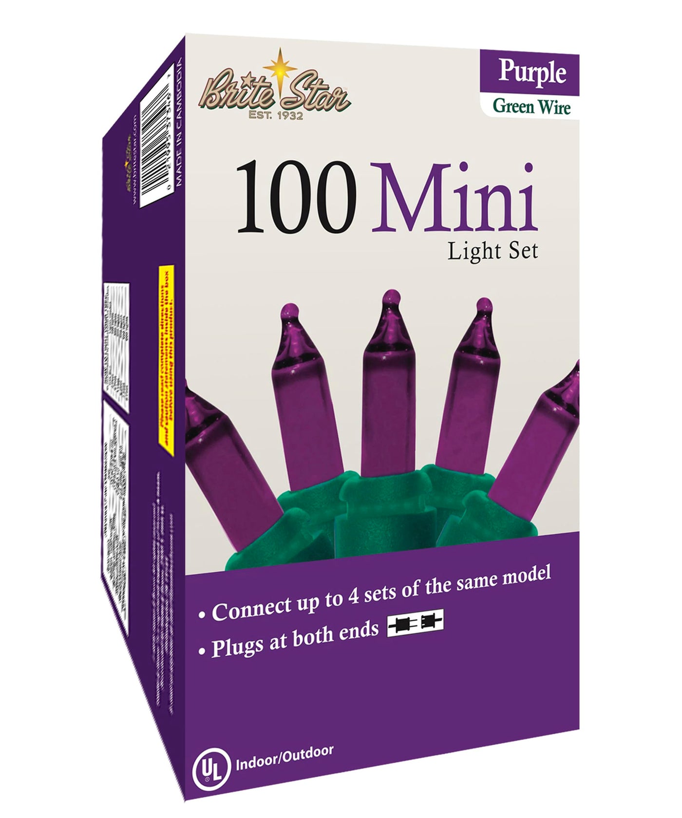 Q: What color are the Brite Star Mini String lights?A: The Brite Star Mini String Christmas Lights feature a warm purple glow, perfect for adding a festive touch to your Christmas decorations or any special occasion.