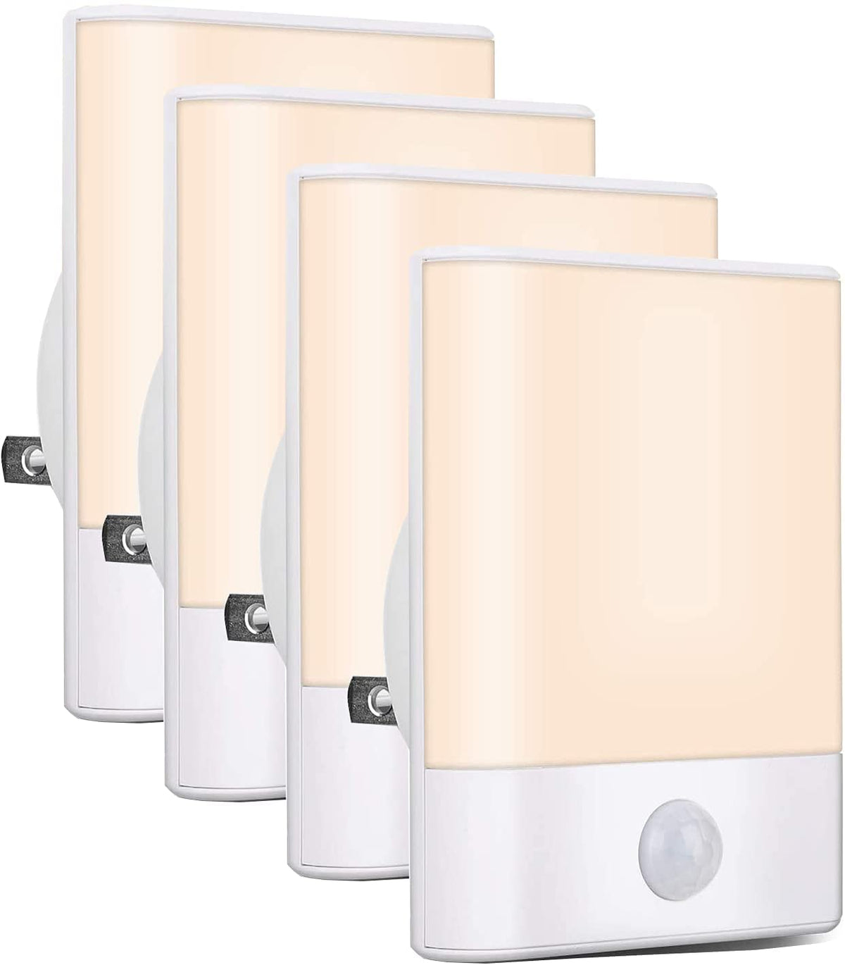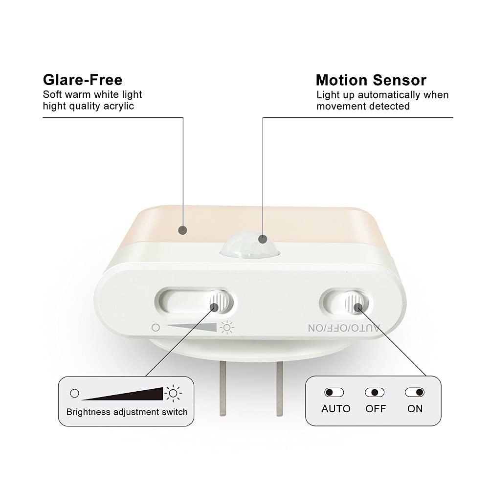 Description This Plug In Night Light Is A No-Battery Powered Motion Sensor Indoor Light With Soft Warm-White Light, It Turns On Automatically Only When Ambient Lighting Becomes Insufficient With People Activated. Ideal For Indoor Usage Such As Living Room, Bedroom, Kitchen, Hallway, Stairway, Especially For Kids Room, Etc. Also, This Led Night Light Draws Minimal Power At 0.9W, That It Is Extremely Safe For You And Your Family. Specifications Nput Voltage: Ac 110-240V Power Consumption: 1W Lifespan: 50,000 Hours Motion Detected Range : Max.10.5Ft / 120 Product Dimension: 85 * 65 *16Cm Product Weight: 58G Features --Motion Sensing Night Light Turns On Automatically When It Is Detected Within 10.5 Feet, And Turns Off After 25 Seconds Of No Activity Detected. --With A Slide Switch To Adjust The Brightness From Highest To Lowest. --Auto/Off/On Toggle Switch To Adjust The Lighting Mode As You Want. --Plug-In Design Is Convenient And Easy For All Indoor Outlet. --Low Power Consumption, Long Life-Span. Package Package Size: 90*75*70Mm Gross Weight:236G Net Weight:216G(4Pcs)