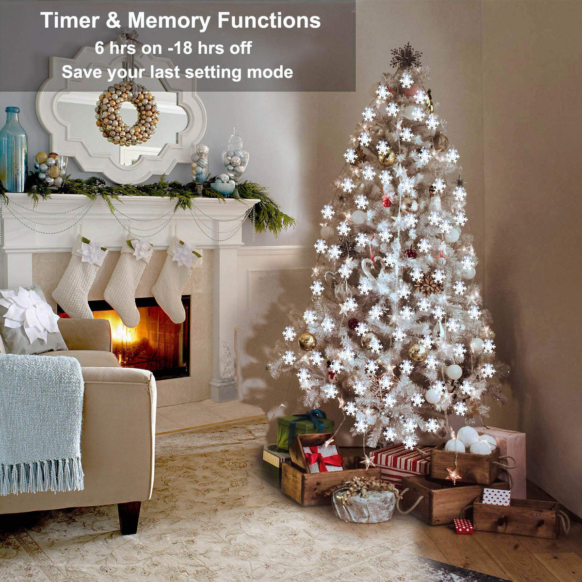 Features: Special Snowflake Shape These battery Christmas lights, with snowflake-shaped designed, combined with bright white led, perfect for Christmas, holidays, wedding party or daily room decorations. Widely used to decorate a door, window, mantle, tree, wreaths, mantel, room or porch. 8 Modes The white snowflake string lights feature 8 lighting modes for your selection, will meet your various needs. Remote Control These snowflake lights come with a remote for easily setting up modes, timer, adjusting brightness or turning on/off in a certain distance without close operating. Very convenient and energy-saving. Dimmable: 4 Brightness Adjustable Levels Snowflake Christmas lights, with 4 different brightness levels. Press the '-' or '+' button on the remote set up your suitable brightness for any special occasion. Waterproof Battery case equipped with a sealed rubber edge design, both the battery box and string lights are waterproof, perfect for both indoor and outdoor decor. Timer:6 Hrs On, 18 Hrs Off Press the 'TIMER' button on the remote to set up, when the timer set up, the snowflake lights string will auto-on for 6 hrs then auto-off for 18 hrs, If the timer do not be changed, the light string will turn on/off at the same time every day. If you want to cancel the timer, press the 'ON' button to cancel Specifications: Total Length: 16.08ft Lighted Length: 12.80ft Lead Length: 3.28ft Bead Space: 3.93Inch LED Quantities: 40 LED Light Color: Cool White Wire Color: Clear Snowflake Diameter: 1.38 Inch Power By: 3 x AA(Not included) Package Included: 1 x White Snowflake Lights 1 x Remote Control 1 x User Manual