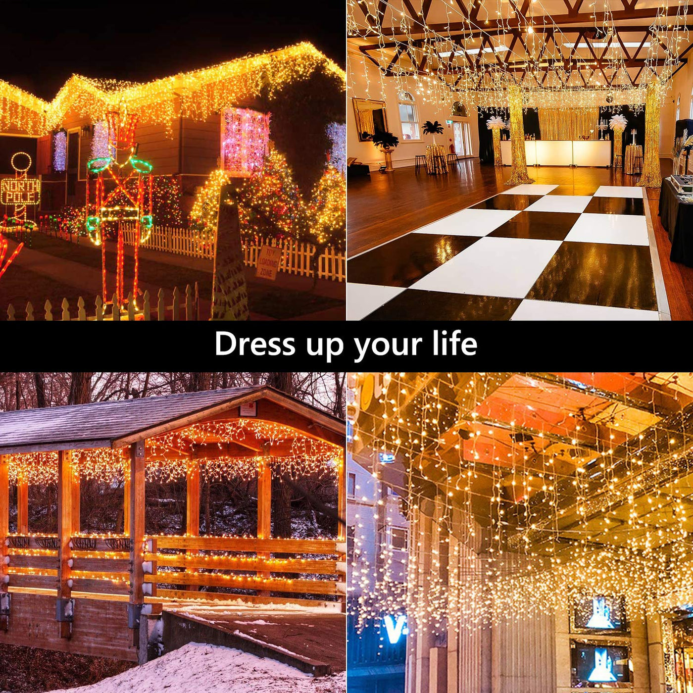 Features: Timer Settings: - 6H: 6Hrs On, 18Hrs Off - 8H: 8Hrs On, 16Hrs Off - 6639: 6Hrs On, 6Hrs Off, 3Hrs On, 9Hrs Off Lights Will Be Auto-On/Off As Scheduled Once The Timer Is Set. Memory Function When Restarting, These Icicle Lights Come With A Memory Function That Can Recover From The Previous Setting Mode. 8 Lighting Modes 8 Modes To Meet Your Lighting Needs: Combination, In Waves, Sequential, Slo-Glo, Chasing/Flash, Slow Fade, Twinkle/Flash, And Steady On. End To End Connectable Connectable Design Can Connect Up To 3 Sets, Expandable For A Longer Length To Meet Your Decorating Needs. Safe To Touch 29V Low Voltage Power Adapter, Excellent Heat Dissipation, And Safe To Touch! Brightness Adjustment 100%-75%-50%-25% 4-Level Brightness, Brightness Can Be Adjusted According To Your Needs. Specifications: Total Length: 45.48Ft Lead Length: 16.4Ft Lighted Length: 29Ft Wire Color: Clear Wire Lights Color: Warm White Bulb Space: 0.26Ft Length Between Two Drops: 0.49Ft Led Quantities: 360 Led Package Included: 1 X 360 Led Icicle Lights 1 X Remote Controller 1 X User Manual