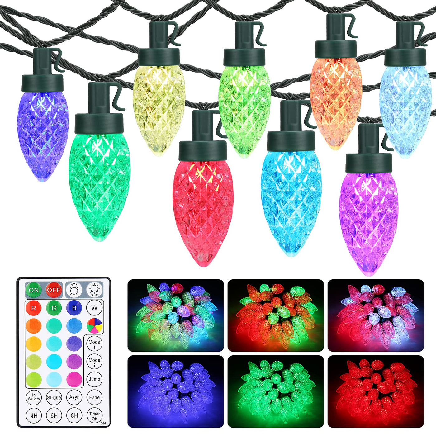 commercial grade c9 LED color changing Lights String, a Must-Have for a cool and Stylish christmas Decoration as the following advantages: 1 Upgraded color changing christmas Lights with Steady On Multi color: Based on customers voice on the need of solid on multi-color of our RgB lights string last year, we now make it available It definitely buys one, get all colors You can turn to red, green, blue, multicolor, red & green or blue & green etc, and there are a lot of twinkle modes 2 connectable:End to end connectable up to 6 sets, total 300 lights, 198ft length, will meet your desired length to your festival decorative project 3 Indoor & Outdoor christmas Lights: Our c9 Xmas tree lights are water-resistant and even work well in rainy days Warm tips: Please kindly protect the power adapter from the water while used outdoors 4 ETL certified: ItAs safe and durable 5 Design with Memory Function: Just set your favorite mode, it will light up directly to this setting next time when turned on, no need to reset it every time (Note: ASYN Mode without Memory Function) 6 Easily Remote controlled: c9 colored Xmas lights come with a remote, allowing you to turn it onoff, switch colors and modes, adjust brightness & speed, or set timer 7 4H6H8H Timer: Timer can be set on 4H 6H & A8HA by remote, then this color changing c9 lights will be auto on for 468 hours and off for 201816 hours per day 8 Speed Adjustable & Dimmable: Steady on mode allow to adjust brightness and dynamic modes allow to adjust flashing speed Specifications: Total Length: 494ft Lighted Length: 33ft Lead Length: 164ft Bulb Space: 066ft Lights color: RgB Wire color: Dark green Bulb Type: c9 Bulb Light Quantity: 50 Package Included: 1 x c9 Xmas Lights 1 x Remote 1 x User Manual