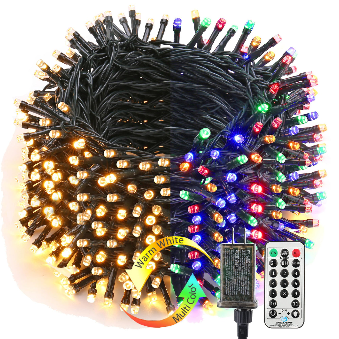 Features: 2-in-1 Multi-function led Easter lights, color changing-warm white & multicolor can be chosen in one string lights for excellent decorations! Built-in memory function, remember your last mode, no need to reset every time, just set your favorite mode and enjoy.100%-75%-50%-25% 4 level brightness dimmable, adjust to get the right brightness to fit home night decoration, party or holiday, etc.11 lighting modes with selectable dual colors, amazing pastel Easter decoration with funny.Built-in timer function, 3 timers are available for you to choose from, once set, the indicator light on the controller will turn on red lights, and the light will auto on/off per day without manual operation. 30V UL certified black power adapter, green wire indoor outdoor decorative string lights, match well with Easter decor, etc., bringing you stunning decoration!Come with 19 key remote, up to 16.4-26.25ft wireless rangeSpecifications: Total Length: 279ftLighted Length: 262ftLead Length: 16.4ftLED Quantities: 800 LEDBulb Space: 0.33ftWaterproof: IP44Voltage: 120V/60Hz Lights Color: Warm white & multicolor(Red, Yellow, Blue, Green) Wire Color: Green WirePackage Included:1 x 800 LED Christmas Lights1 x Remote Control 1 x User Manual