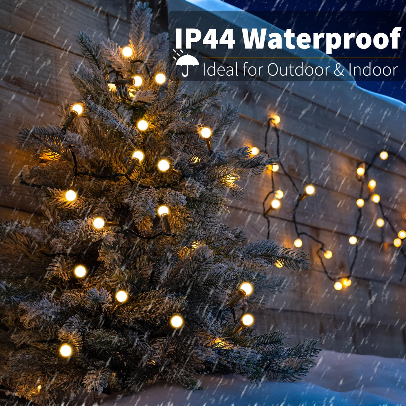 Features: Extendable End-To-End Up To 2 Sets. 2-In-1 Multi-Function Led Berry Christmas Lights, Color Changing-Warm White & Cool White Can Be Chosed In One String Lights For Excellent Decorations! Built-In Memory Function, Remember Your Last Mode, No Need To Reset Every Time, Just Set Your Favorite Mode And Enjoy. 100%-75%-50%-25% 4 Level Brightness Dimmable, Adjust To Get The Right Brightness To Fit Moment Like Decoration, Reading Or Kids' Sleeping Time Etc. 11 Lighting Modes With Selectable Dual Colors, Amazing Christmas Decoration With Funny. Built-In Timer Function, 3 Timers Are Available For You To Choose From, Once Set, The Indicator Light On The Adaptor Will Turn On Green Lights, And The Light Will Auto On/Off Per Day Without Manual Operation. Ul Certify Black Power Adapter, Green Wire Indoor Outdoor Decorative String Lights, Match Well With Christmas Tree Etc., Bringing You Stunning Decoration! Come With 19 Key Remote, Up To 16.4-26.25Ft Wireless Range Specifications: Total Length: 82.4Ft Lighted Length: 66Ft Lead Length: 16.4Ft Bulb Space: 0.33Ft Waterproof: Ip44 Voltage: 120V/60Hz Lights Color: Warm White & Cool White Package Included: 1 X 200 Led Warm White & Bright White Color Changing Globe String Lights 1 X User Manual 1 X Remote Controller