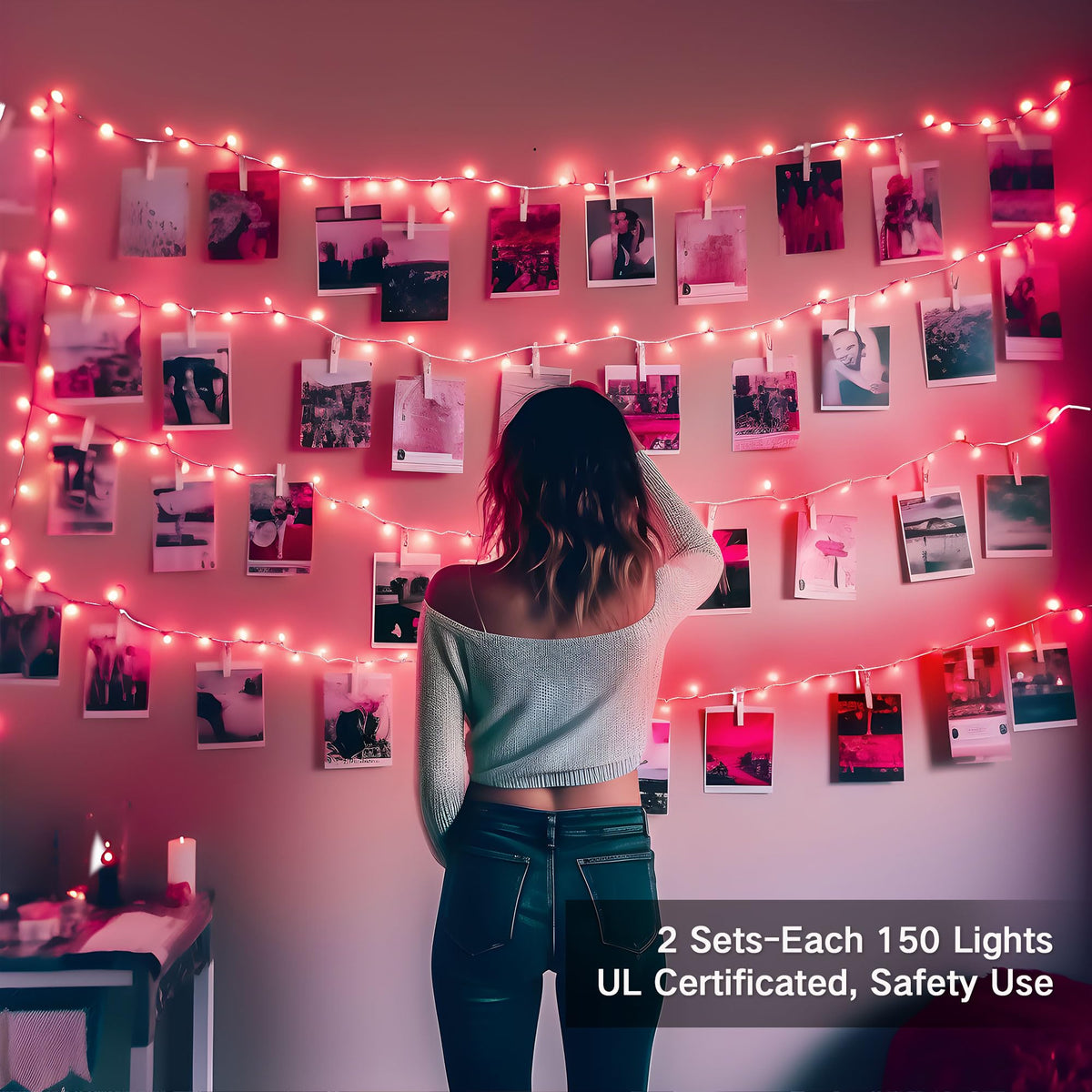 Brizled 300 Counts Connectable White Cord Pink String Lights for Valentine's Day, Wedding, Birthday, Anniversary, Graduation Season Parties or Daily Decor.Features: 300 counts pink incandescent mini string lights, non-LED Feature end-to-end connector can connect up to 3 sets (450 lights) White cord combined with pink lights to suit dress up Weddings, Valentine's Day, Birthdays, Anniversaries, Graduation Season Parties or Daily Decor For both indoor and outdoor use UL-certified, safe to use Extra bulbs and fuses included Specifications: Light Color: Pink Bulb Type: Incandescent Bulbs Wire Color: White Wire Bulb Quantity: 2*150 count Voltage: 120V Bulb Space: 0.21ft Total Length: 69.6ft(34.8ft per string) Lead Length: 0.21ft Waterproof Class: IP44 Package Included: 2 x 150 Count Pink Christmas Lights 4 x Extra Bulbs 4 x Extra Fuses