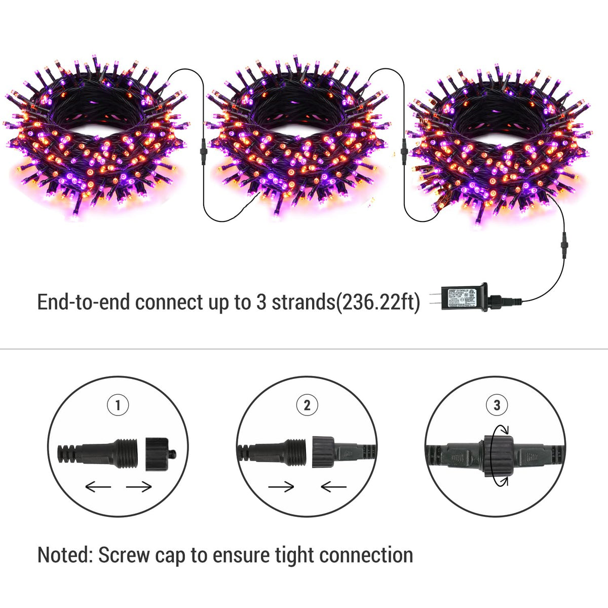 Brizled 240 LED Purple & Orange Halloween String Lights Purple/orange string lights, emitting the most popular purple & orange glow for Halloween, ideal for decorating your Halloween, Thanksgiving, tree, party, bedroom, living room, garden, fence, wreath, fireplace, window to create a spooky Halloween atmosphere. Extendable Can connect up to 3 string lights with male and female end-to-end connected. 240 LED 78.74ft per string, maximum up to 720 LED 236.22ft Waterproof These mini purple & orange Halloween lights are IP44 waterproof, suitable for both outdoor & indoor decorations. Note: The adapter of lights is not waterproof, please kindly protect the power adapter from the water! Timer & Memory Supports 6 hrs on, 18 hrs off, just long-press the round button on the adapter, while green lights on, timer activated, then long-press again, while green lights off, timer canceled, very convenient to set up your timer. Combine with the memory function, which will save you the last mode, no need to set it up every time. 8 Lighting Modes 8 lighting modes, just press the round button on the adapter to switch mode, which will meet your various lighting decoration desires. Specifications: Total Length: 95.14ft Lighted Length: 78.74ft Lead Length: 16.4ft Quantity of Lights: 240 LED Bulb Space: 0.33ft Waterproof: IP44 Input Voltage: 120V Output Voltage: 30V Lights Color: Purple & Orange Wire Color: Dark Green Package included: 1x 240 LED Purple & Orange String Lights 1x User Manual