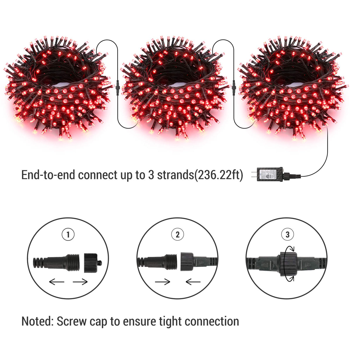 Designed for both indoor and outdoor use, these string lights are waterproof, meaning they can withstand various weather conditions. The lights come equipped with a total length of 95.14 feet, including a lighted length of 78.74 feet and a lead length of 16.4 feet. With 240 vibrant red LEDs spaced at 0.33 feet apart, they provide ample illumination for decorating trees, fences, gardens, and more.