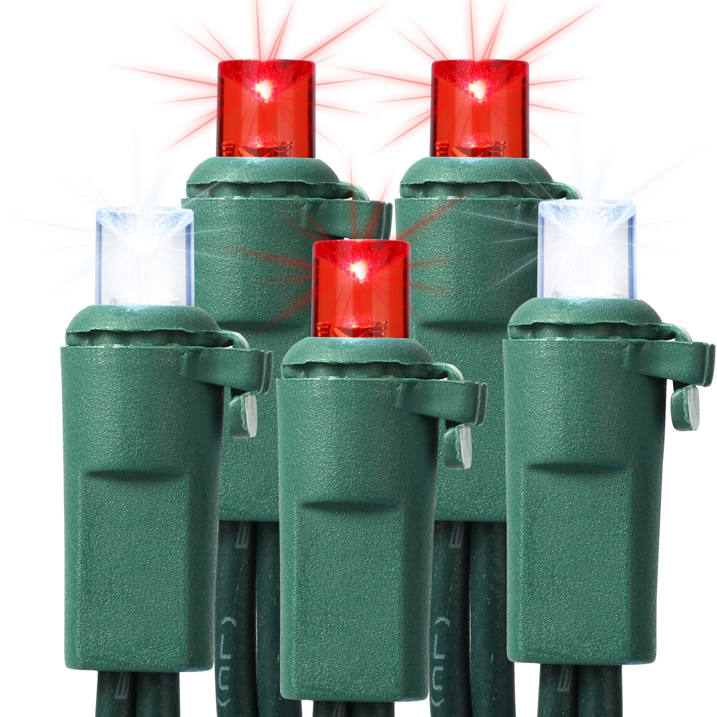 Specifications: Total Length: 33.66ft Lighted Length: 33ft Lead Length: 4in Length from the Last Bulb to the Female Plug: 4in Wire Color: Green Wire Lights Color: Red & White Bulb Space: 4in LED Quantity: 100 LED