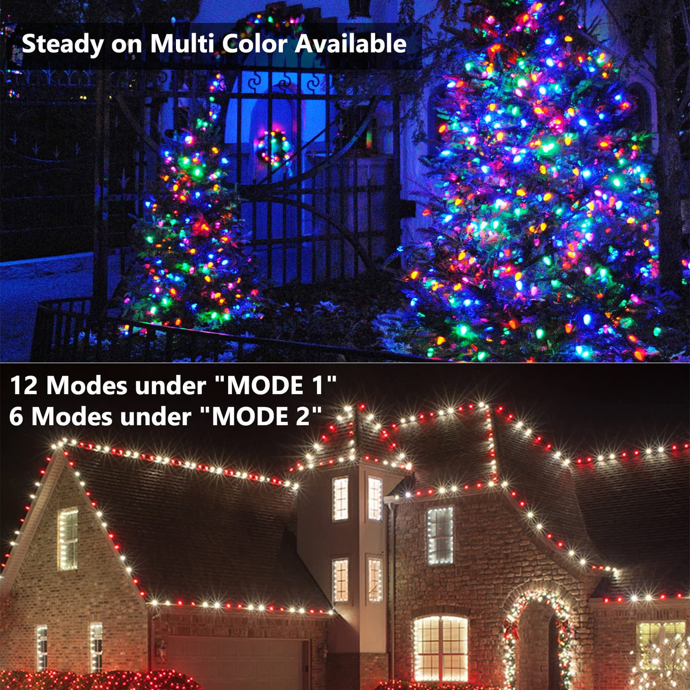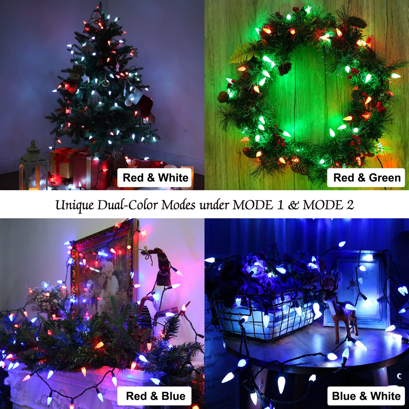 Commercial Grade C5 LED Color Changing Lights String, a Must Have for a Cool and Stylish Christmas Decoration as the following advantages: 1.Upgraded Color Changing Christmas Lights with Steady On Multi Color: Base on customers voice on need of solid on multi-color of our RGB lights string last year, we now make it available! It’s definitely buy one, get all colors! You can turn to red, green, blue, multicolor, red & green or blue & green etc, and there are a lots of twinkle modes 2.Connectable: End to end connectable up to 3 sets, total 300 lights, 99ft length, you will find your desired length according to your festival decorative project! 3.Indoor & Outdoor Christmas Lights: Our C5 Xmas tree lights are water-resistant and even work well in rainy days! Warm tips: When using outdoor, please kindly protect the power adapter from the water. 4.ETL Certified: It’s safe and durable! 5.Design with Memory Function: Just set your favorite mode, it will light up directly to this setting next time when turned on, no need to reset it every time. 6.Easily Remote Controlled: C5 colored Xmas lights come with remote, allowing you to turn it on/off, switch colors and modes, adjust brightness & speed, or setting timer! 7.4H/6H/8H Timer: Timer can be set on "4H" "6H" & “8H” by remote, then this color changing C5 lights will be auto on for 4/6/8 hours and off for 20/18/16 hours per day! 8.Speed Adjustable & Dimmable: You can adjust brightness when lights stay steady, or choose your favorite flashing speed for dynamic modes, ideal for any occasions!