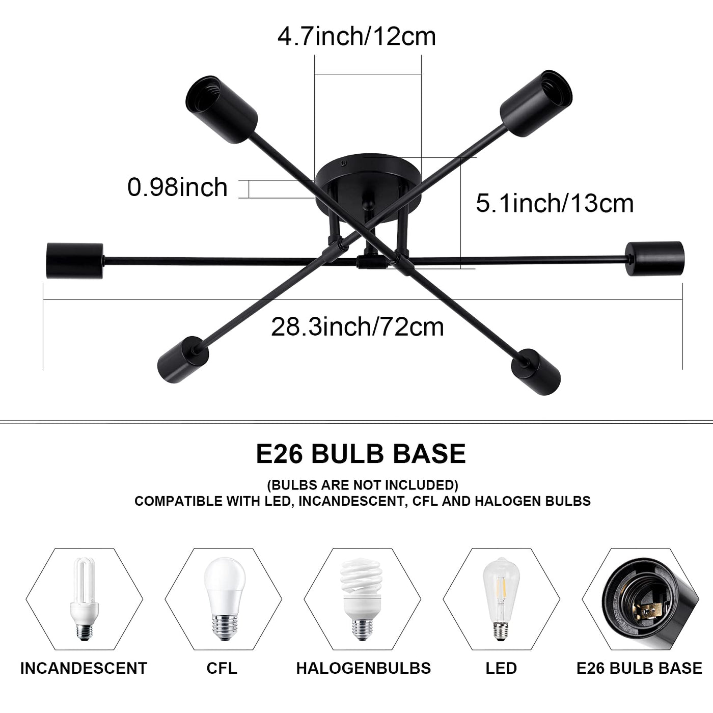 Q: What type of bulbs can I use with the BrkNit 6-Light Sputnik Chandelier?A: The BrkNit 6-Light Sputnik Chandelier features an E26 bulb base, making it compatible with various bulb types including LED, Edison, incandescent, CFL, and halogen bulbs. Please note that bulbs are not included with the fixture.