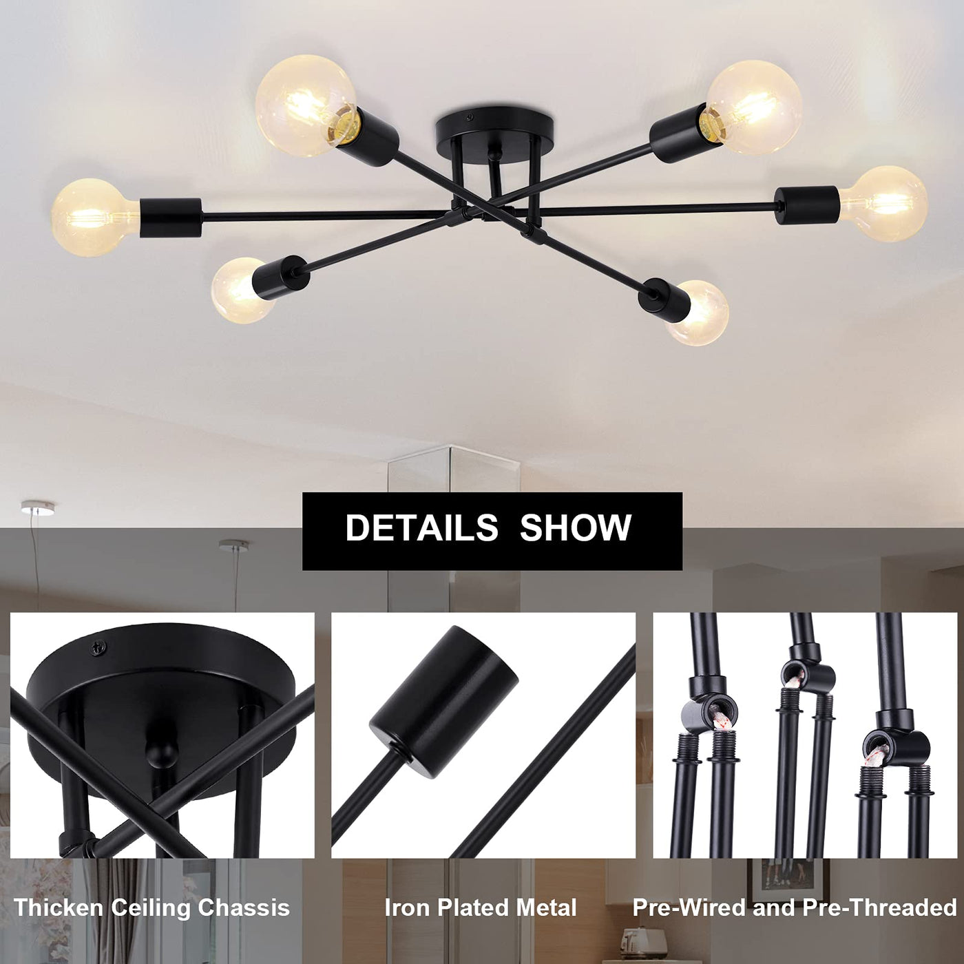 BrkNit 6-Light Sputnik Chandelier, Black Iron Semi Flush Mount, Model J0035, Vintage Farmhouse Lighting for Dining Room, Bedroom, Living Room
