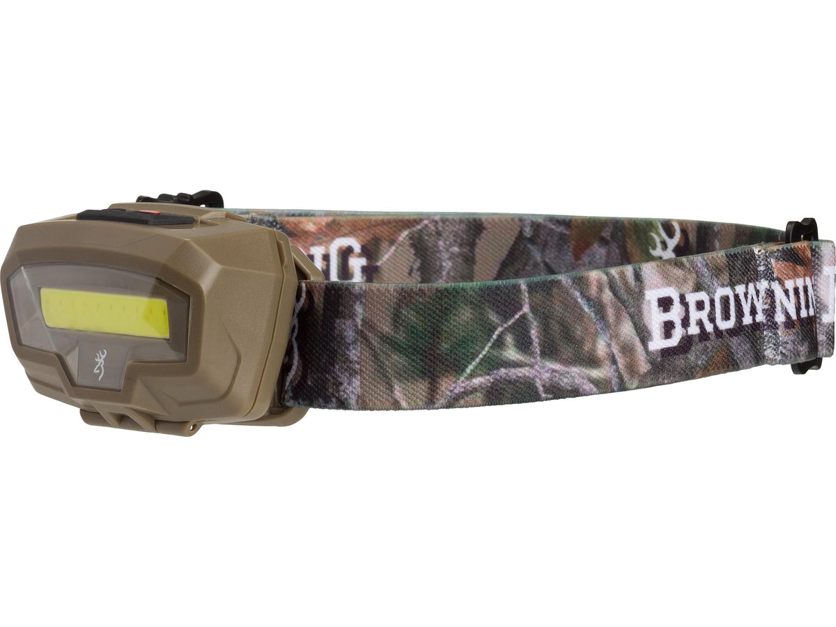 The Browning Night Gig Headlamp features a 26-485 lumens output with 6 modes: High, medium, low, white flashing, low red, and red flashing. This headlamp runs on three standard AAA batteries (included). It is water resistant and impact resistant up to 1 meter. The Night Gig also features Wide Angle Technology which offers an ultra-intense, wide angle beam and a flat dark earth body with camo headstrap.