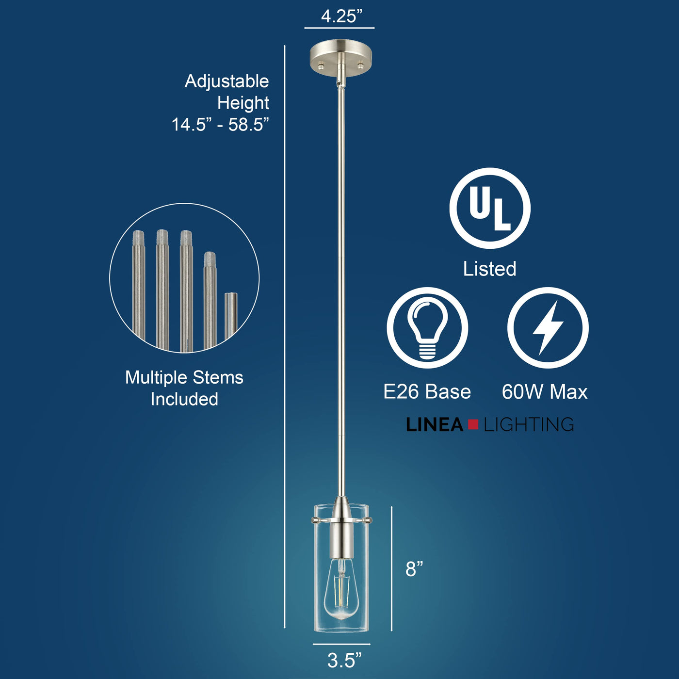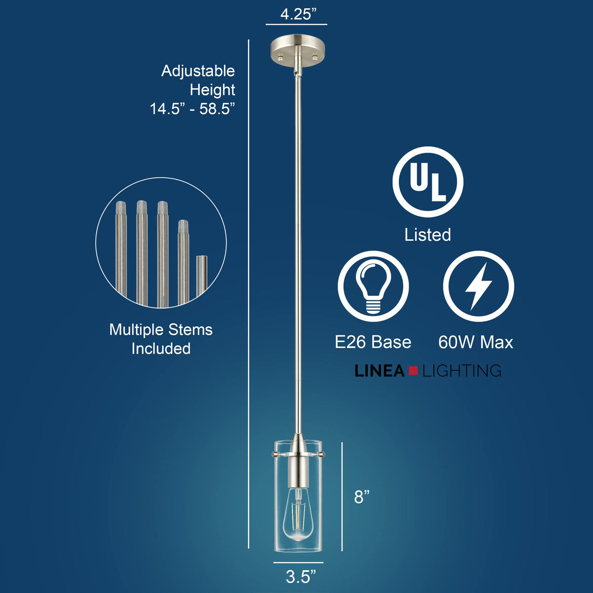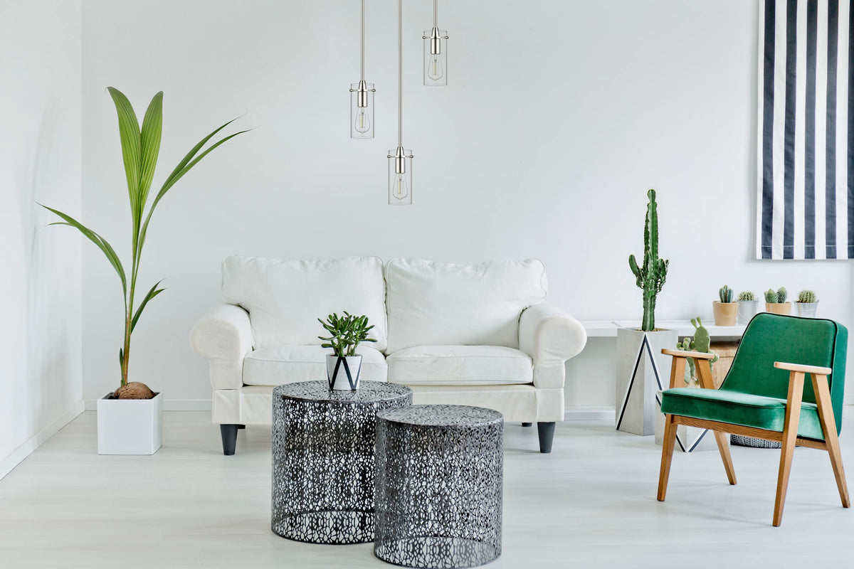 The Effimero small modern glass hanging pendant light fixture makes a dramatic design statement. The industrial farmhouse light design features a clear glass cylinder shade which provides maximum illumination. The adjustable height Effimero hanging ceiling light blends with many decor styles and is perfect as pendant lighting for kitchen island, over kitchen tables and counters, as a dining rooms light or hallway or bathroom lighting. Metal construction with a brushed nickel finish Measures 4.25 inches wide by 14.5 inches high; shade measures 3.5 inches in diameter by 8 inches high Adjustable - includes 5 hard stems in assorted lengths for a variety of hanging heights; 14.5 inches minimum hanging height and 58.5 inches maximum hanging height Dimmable when used with dimmable bulb and compatible dimmer switch Uses three E26-base bulbs, 60W max (not included) Works with most bulbs - compatible with smart bulbs or most medium base bulbs up to 60W 4.25 inch round swivel canopy works with sloped or vaulted ceilings UL listed
