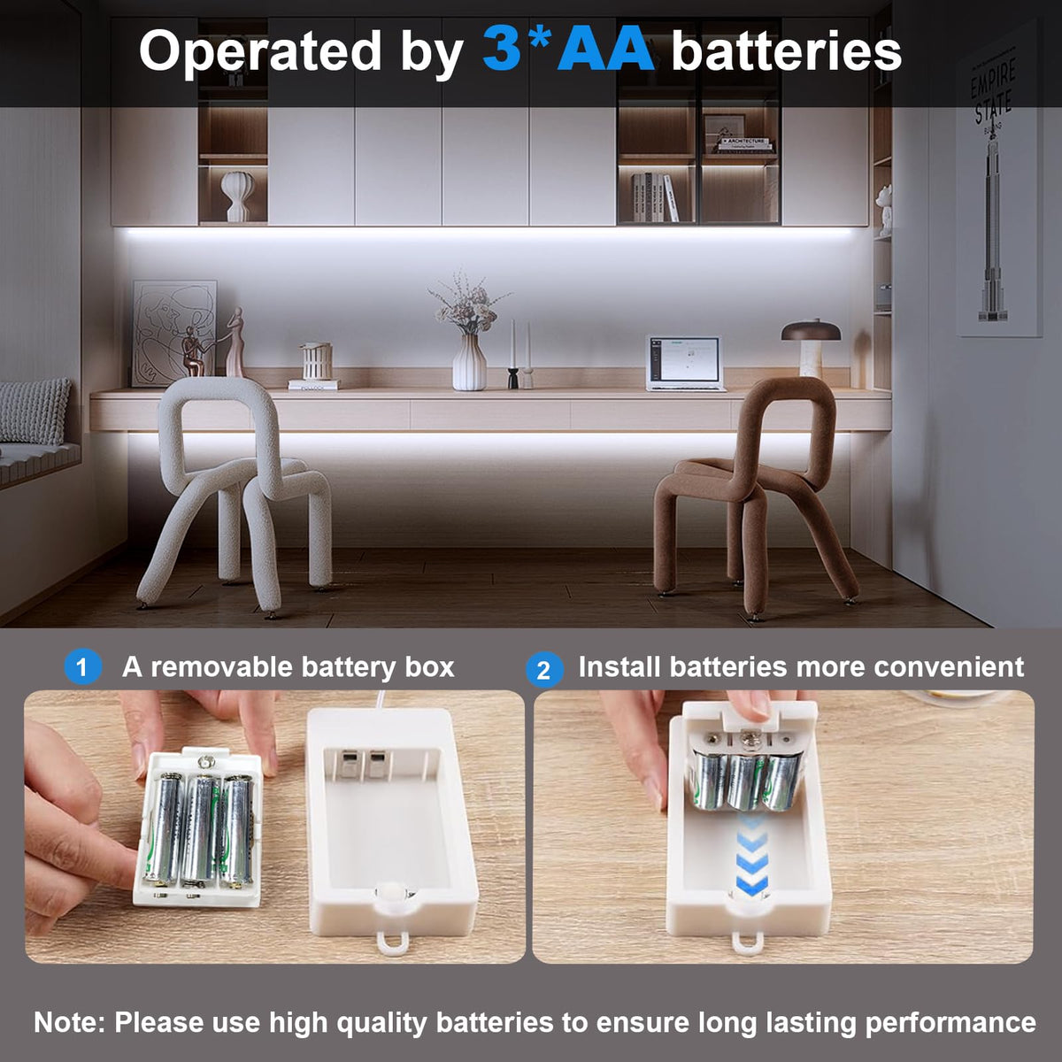 Q: What type of batteries does the BSGlobal COB LED Strip Light require?A: The COB LED Strip Light operates using 3 AA batteries, which are not included with the product. The battery box is easily accessible for quick battery replacements, allowing for hassle-free operation without the need for electrical outlets.