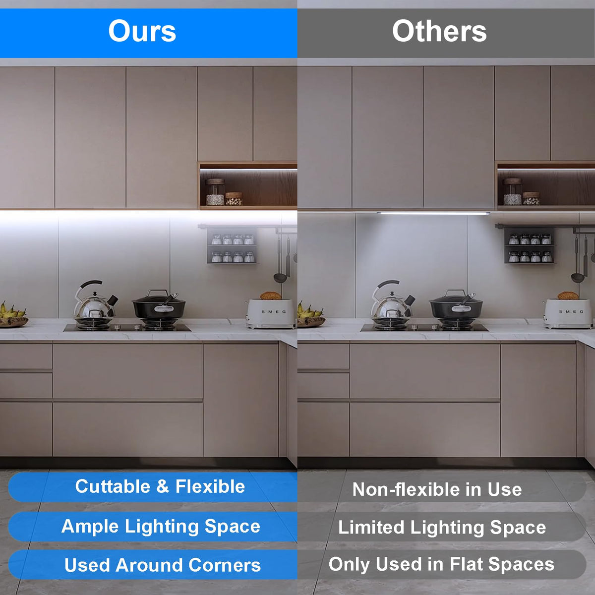 Q: Are these LED strip lights suitable for outdoor use?A: The BSGlobal COB LED Strip Light is designed primarily for indoor use, making it ideal for cabinets, wardrobes, kitchens, and bedrooms. For outdoor applications, ensure that the installation area is protected from moisture and direct exposure to the elements, as the product is not waterproof.