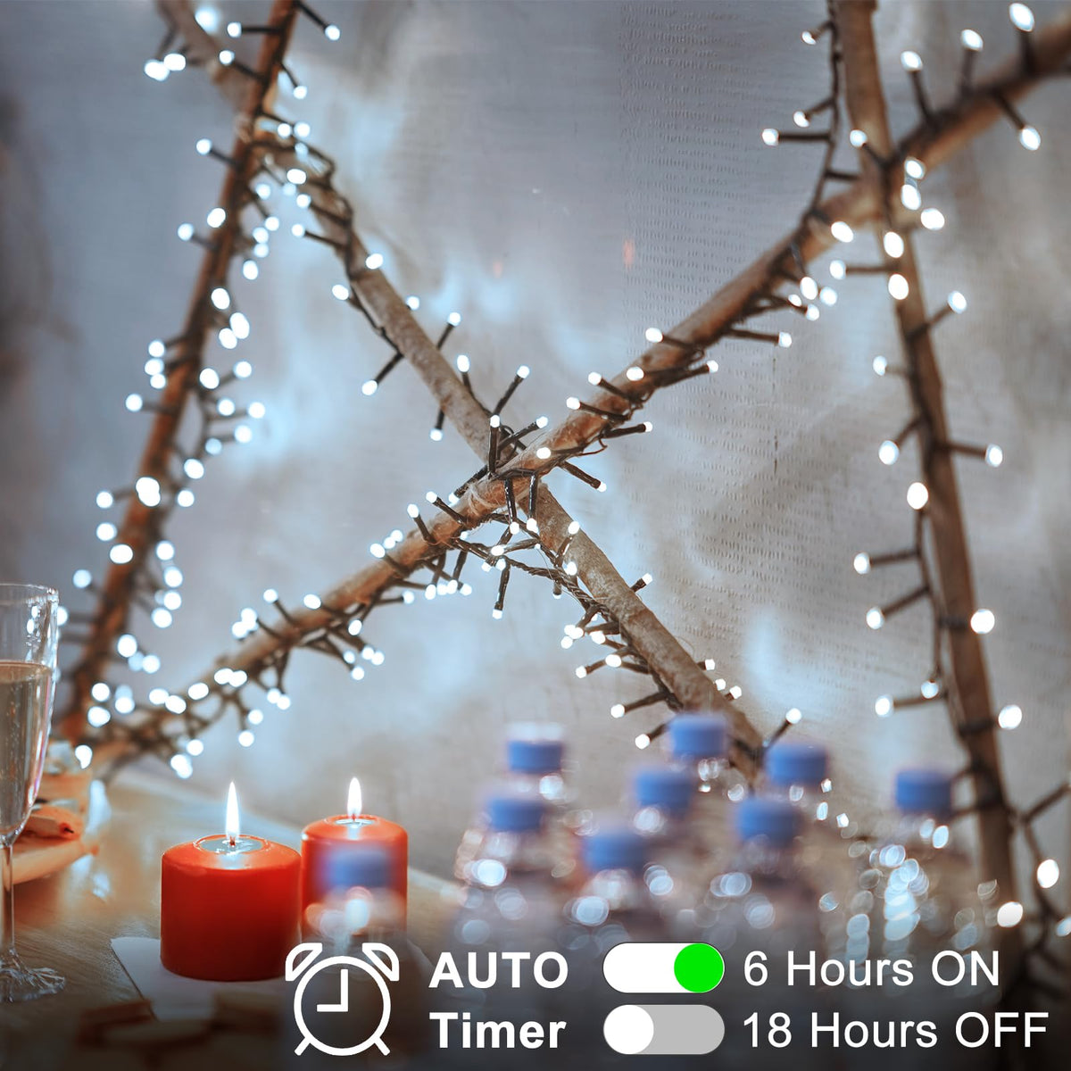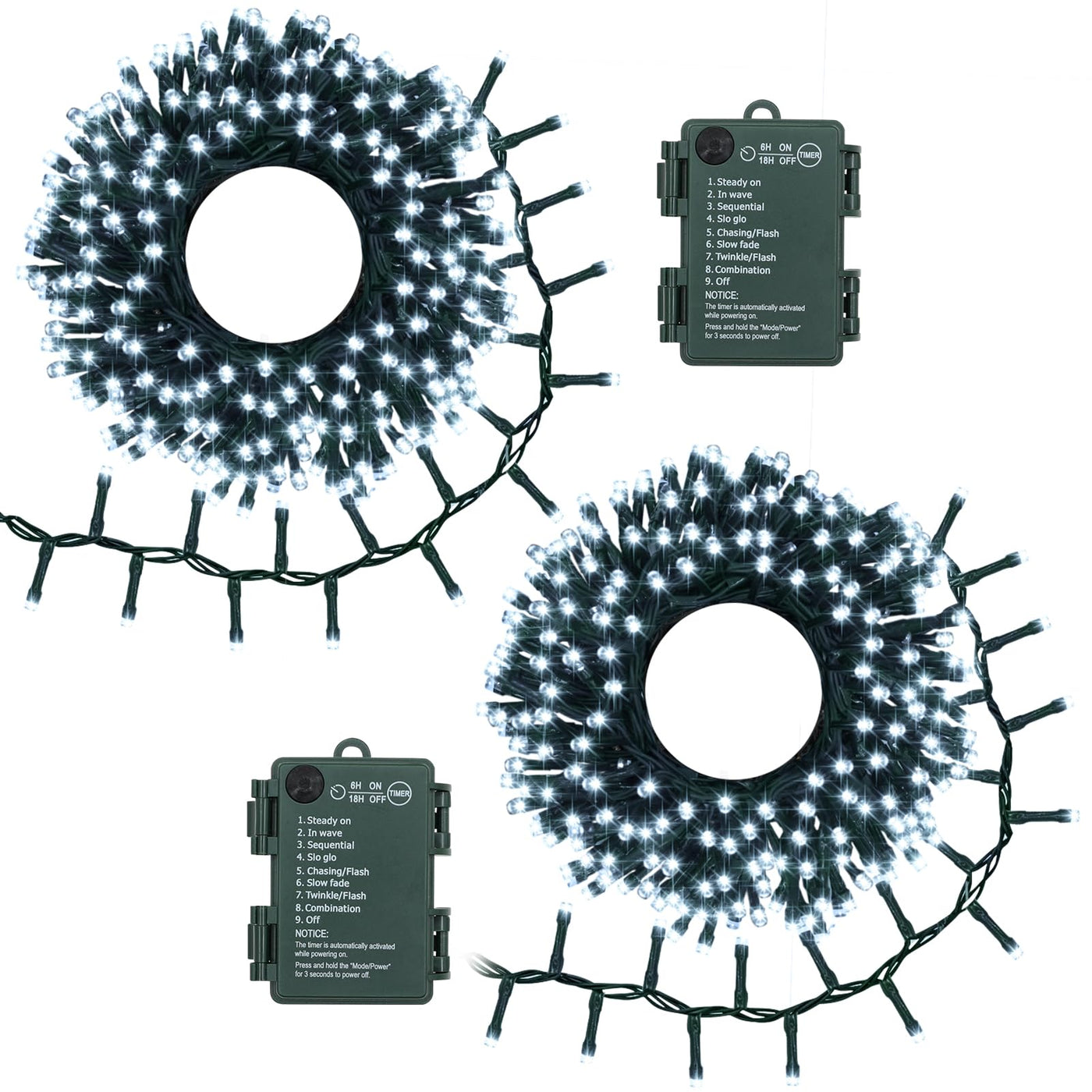 2 Pack Battery Operated Cluster Lights 10Ft 200 LED Twinkle String Lights 8 Modes Timer Waterproof Cluster Fairy Lights for Christmas Bedroom Wedding Party Tree Decor Specification: Light Color: Cool White LED Quantity: 2*200LED Strip Length: 2*10ft Lead Length: 1.65ft/50cm Waterproof Rate: IP54 Power Source: 3 AA batteries (not included) 8 Modes: Combination/ Wave/ Sequence/ Slow/ Chase/ Flashing/ Slow fade/ Flashing/ Flickering/ Steady on Package Content: 2 x 200 LED Cluster Lights String
